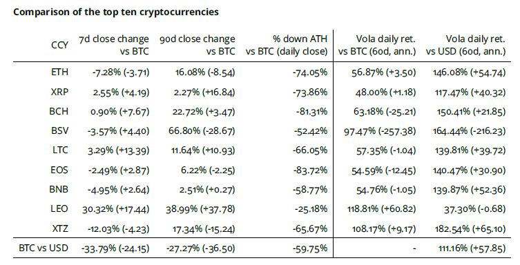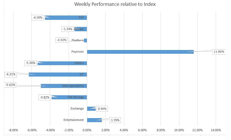 Die Alt-, Mid- und Shit-Indizes bewegen sich immer noch innerhalb der Unterstützungs- und Widerstandsbandbreite gegen BTC. Insgesamt verloren alle drei Indizes rund 35% an Dollar-Performance. Der siegreiche Sektor ist Payment mit dem Coin STEEM. Die STEEM-Gemeinschaft plant einen Hard-Fork um Justin Sun's Steemit Inc zu entfernen. Der Hard-Fork wird zu einer neuen Blockchain namens Hive führen. Abgesehen von den Sektoren Exchange und Entertainment gehörten alle anderen zu den Verlierer Sektoren, die zwischen 30% und 40% zurückgingen.