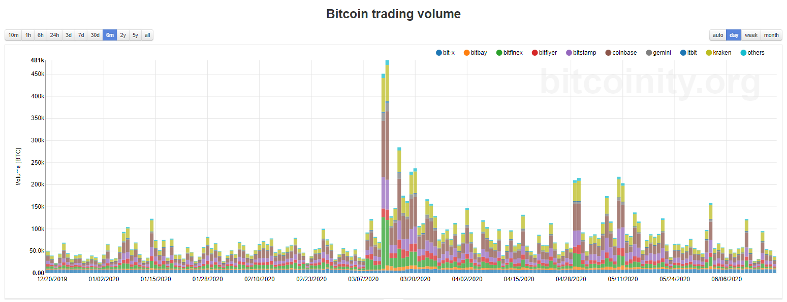 Die wöchentliche Kurskerze spricht für sich selbst. Das Gesamtvolumen an den Spotbörsen ist seit dem Ausverkauf im März kontinuierlich zurückgegangen.