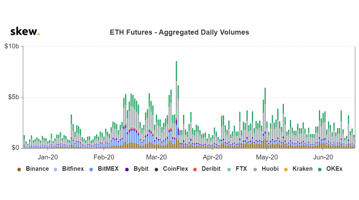 Bei den Derivaten sieht die Sache etwas anders aus. Der Open Interest (OI) stieg stetig an und ist fast wieder auf dem Niveau, das wir vor dem Marktcrash im März gesehen haben. Auch das Volumen für Futures sieht anders aus als das, was wir bei Spot sehen.