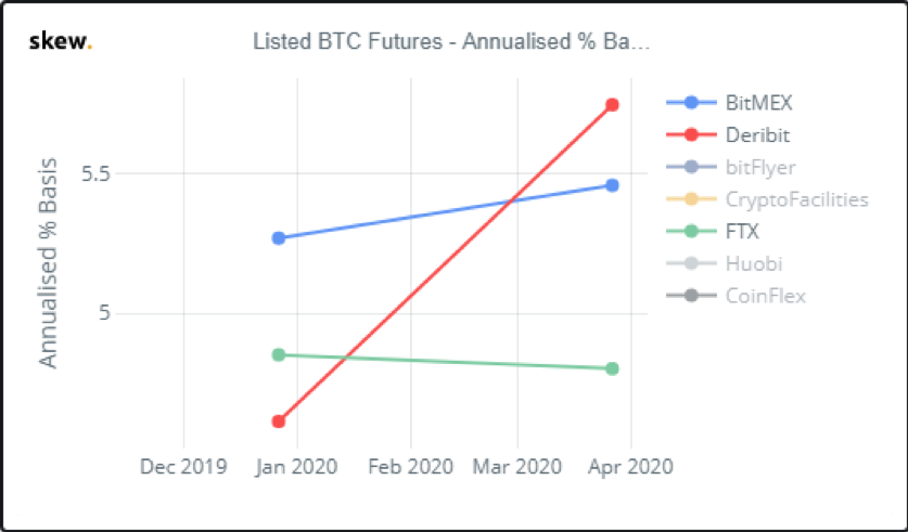 Wenn Sie sich den Chart der jährlichen %-Basis von Skew ansehen, dann stellen Sie fest, dass BitMEX und FTX sehr ähnliche Rollkurven im Vergleich zu Deribit haben. Aber meiner Erfahrung nach ist die Liquidität auf BitMEX und FTX viel höher.