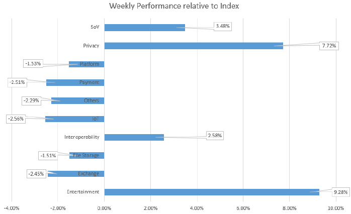 Die Sektoren, die sich besser entwickelten, waren Entertainment, Privacy, Store of Value und Interoperability. Die unterlegenen Sektoren (mit einer ähnlichen Underperformance) sind Exchange, File Storage, IoT, Payment und Platform.