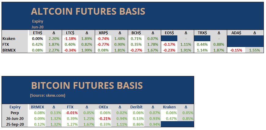 Die Juni-Future-Basis ist an allen Derivatbörsen handelsneutral, während der September-Future hauptsächlich mit Contango gehandelt wird: zwischen 0,25% und 1%. Der Tagesgeldsatz ist derzeit neutral. Die Altcoin-Futures erholten sich und die meisten von ihnen werden wieder neutral gehandelt.