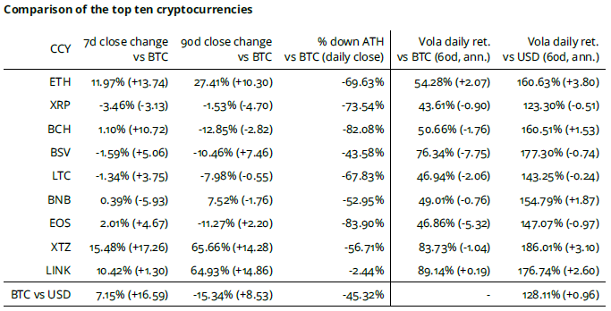 Insgesamt bewegte sich BTC zwischen der kurzfristigen Unterstützung von 6.500 und dem Widerstand von 7.300. In der vergangenen Woche fanden keine grösseren Rotationen statt.