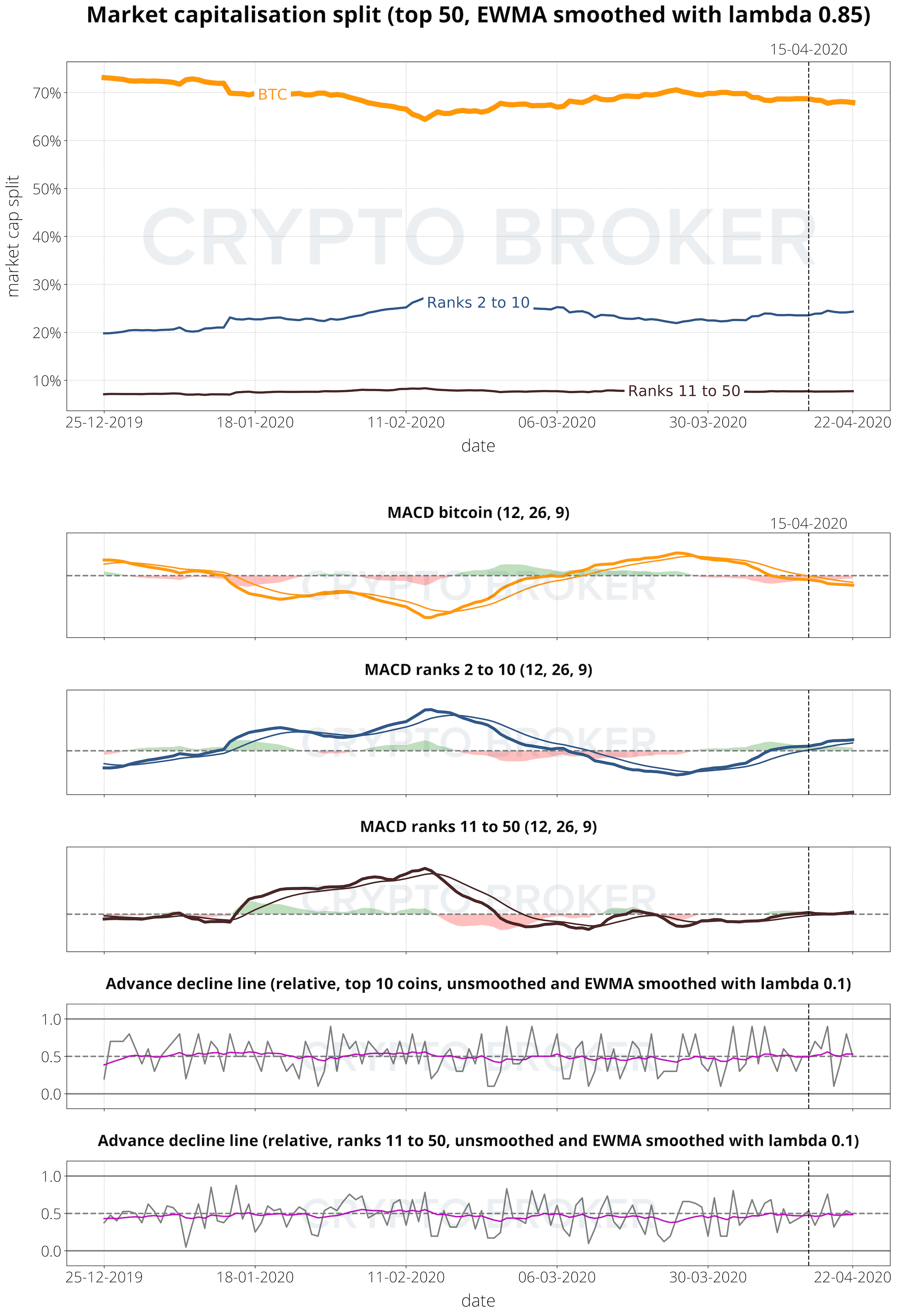 Die MACDs bewegten sich im Mid-Index ein wenig in Richtung eines leicht überkauften Szenarios, aber im Grunde genommen bleiben alle Coins zwischen 1 und 50 neutral.