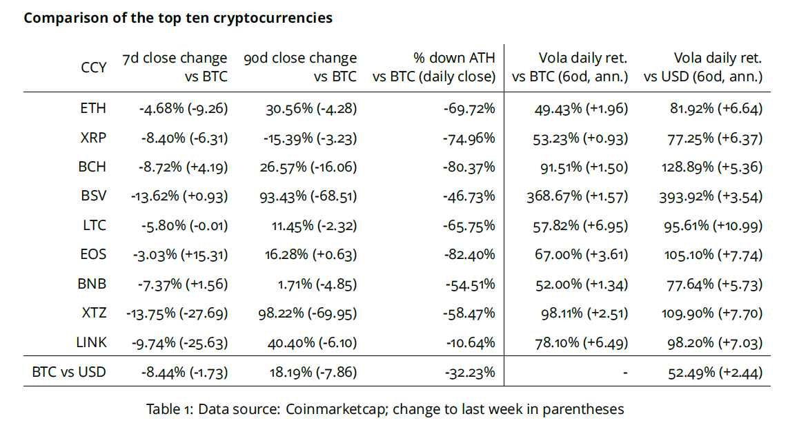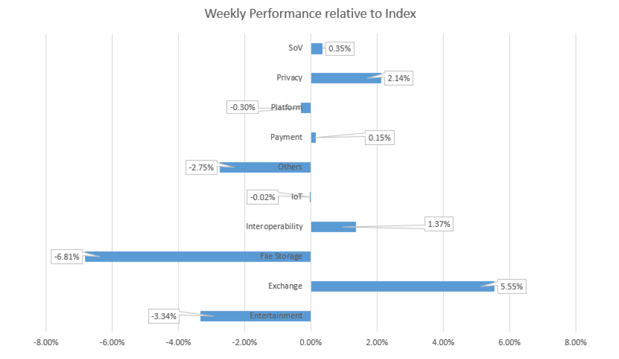 Alle drei Indizes bewegten sich in die Bandbreite der Unterstützungs- und Widerstandsniveaus. Es gab nur ein paar wenige Sektorsieger mit "Exchange", "Interoperability" und "Privacy". Die Verlierer des Sektors waren eindeutig die Bereiche "File Storage" und "Entertainment". Von allen drei Indizes entwickelten sich nur drei Coins positiv: LEO +0,25%, POWR +11% und AION +43%. Die grössten Verlierer waren ELF -30%, SC -31% und ENG -34%.