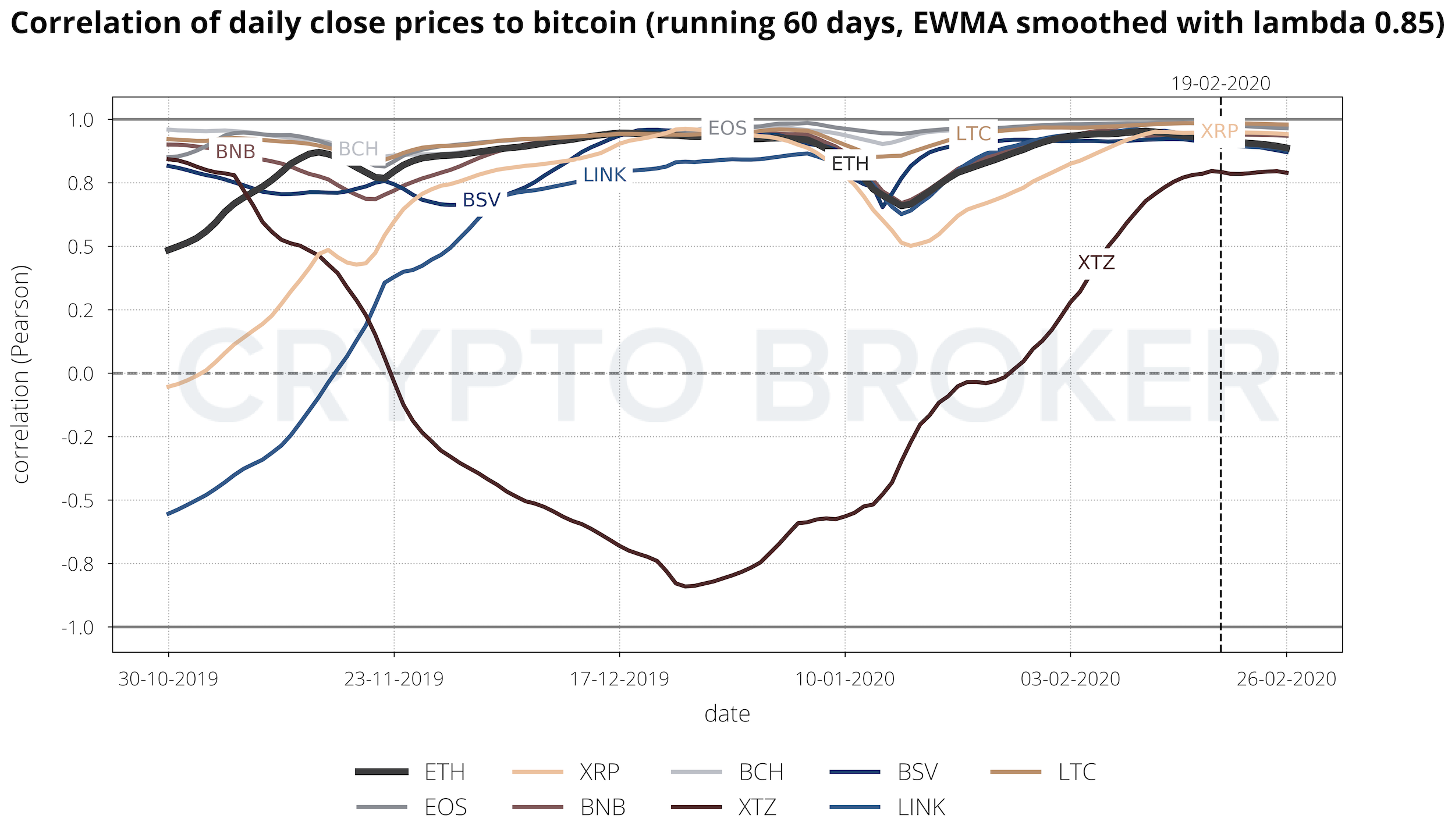 Das Coronavirus hat sich auf weitere Kontinente ausgebreitet und die Korrektur auf dem traditionellen Finanzmarkt führte zu einer Abwärtsbewegung. Die kurzfristige Unterstützung zwischen 9.000 und 9.100 wurde recht gut verteidigt, aber der Druck auf den Markt setzte sich in Richtung der längerfristigen Unterstützung bei 8.500 fort. Die allgemeine Stimmung ist innerhalb weniger Tage bärisch geworden und eine gesunde Konsolidierung hat sich in eine grössere Korrektur verwandelt. Die kurzfristige Unterstützung liegt bei 8.500, während die längerfristige Unterstützung bei 7.500 liegt. Grössere Widerstände liegen auf dem magischen Niveau von 10.000 und danach bei 10.500. Parallel zur Marktkorrektur hat auch eine Rotation stattgefunden.