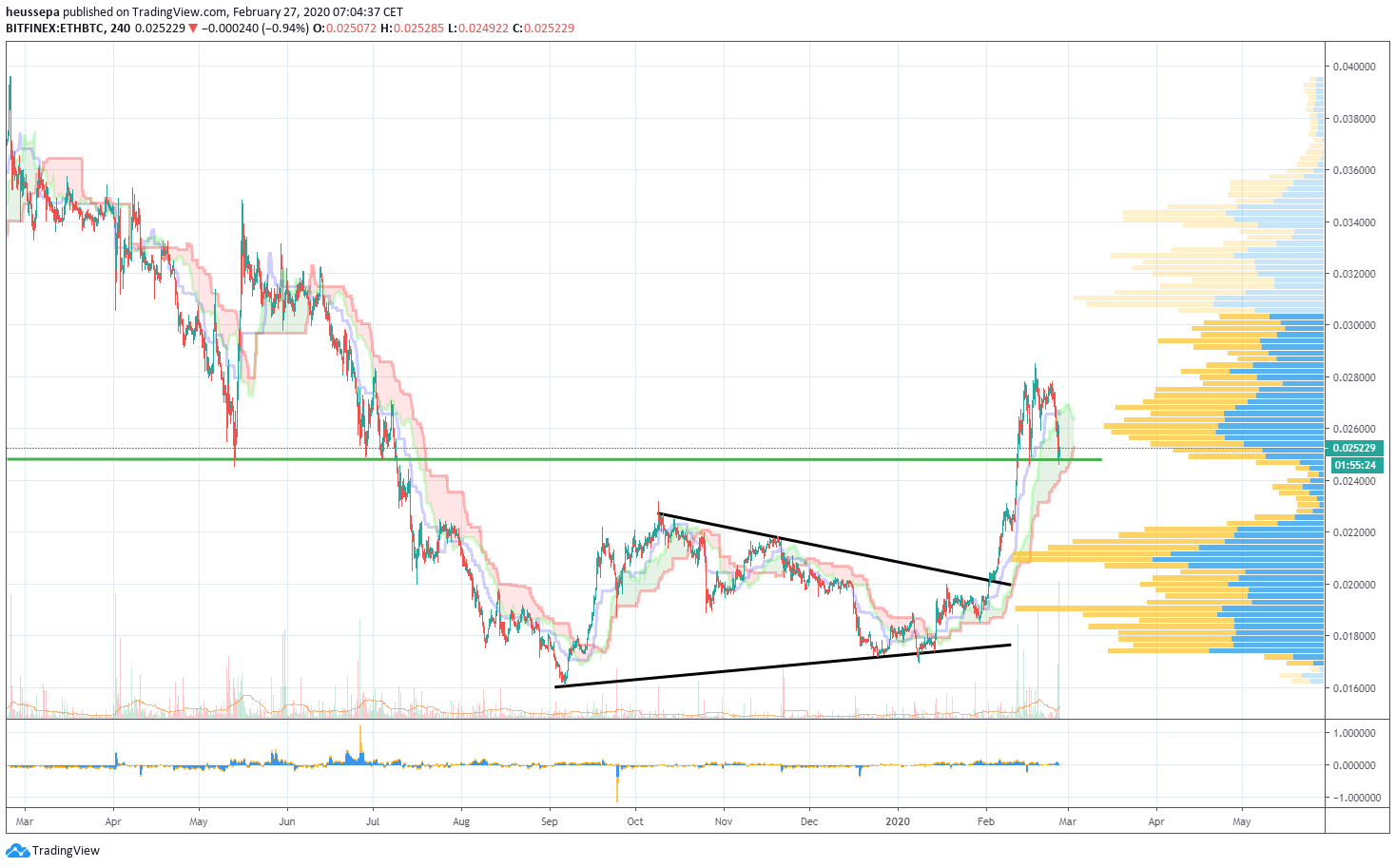 Die Abwärtsbewegung wurde von einem grossen Volumen begleitet und stoppte knapp um unser Unterstützungsniveau von 0,025. Im Vergleich zu den letzten Wochen hat ETH an Glanz und Kraft verloren. Eine Person hatte Recht, als sie sagte: "Es gibt ziemlich viele ETH Bag-Holders". Die späten Investoren haben sich verbrannt und haben wahrscheinlich durch Panikverkäufe ihrer Longs noch mehr Treibstoff zum Ausverkauf beigetragen.