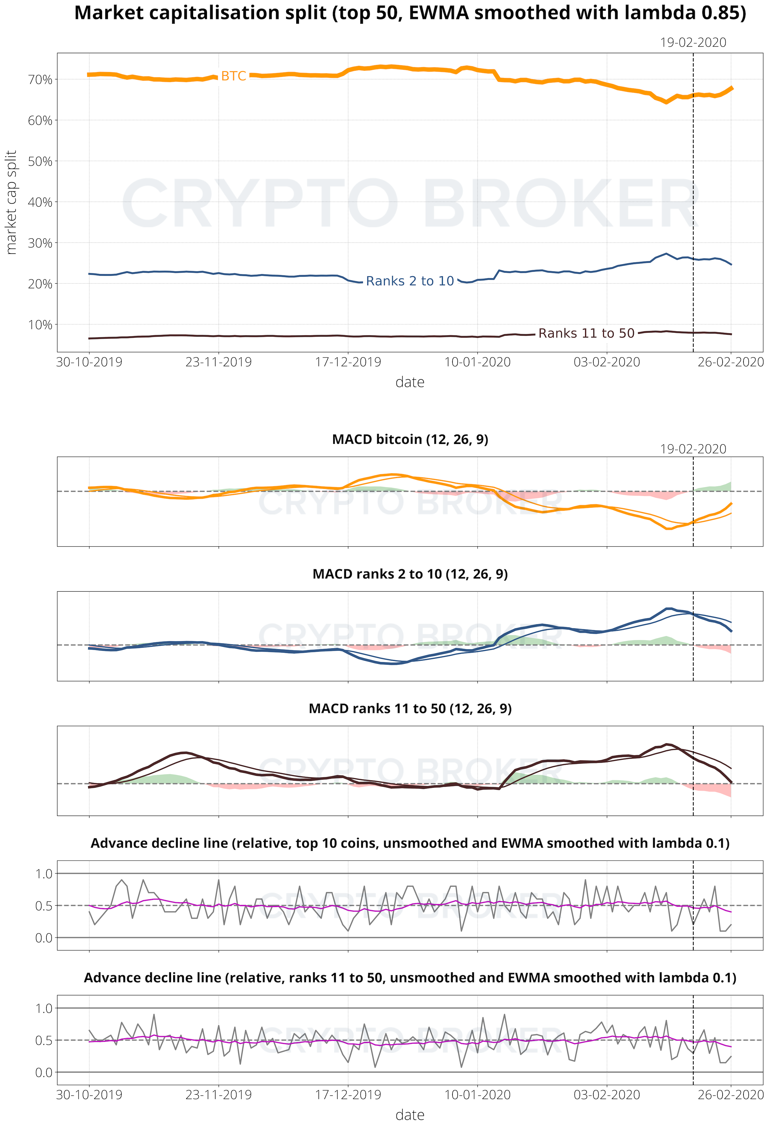 Die MACDS für die Coins auf den Rängen 2 bis 50 begannen zu reagieren und glätteten die überkaufte Situation ein wenig. Die MACDs für BTC drehten sich und bewegten sich in eine neutralere Zone.