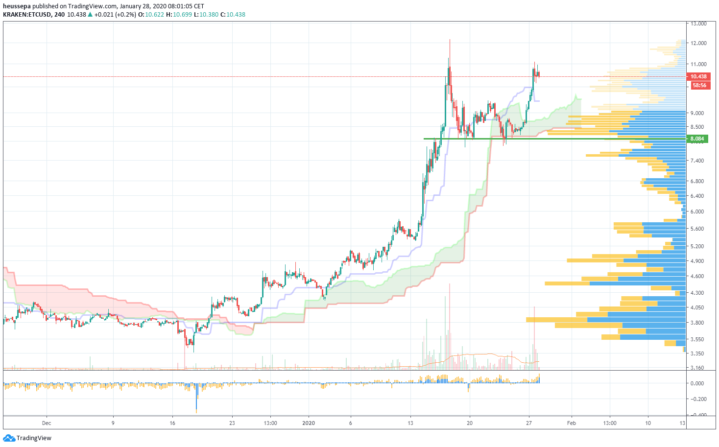 Solange wir über der 8-Dollar-Marke bleiben, bin ich bullisch. Tatsächlich erwarte ich nicht, dass ETC unter 9 Dollar gehandelt wird. Eine gewisse Konsolidierung wäre jedoch wünschenswert, um das jüngste Hoch von 12 Dollar erfolgreich anzugreifen.