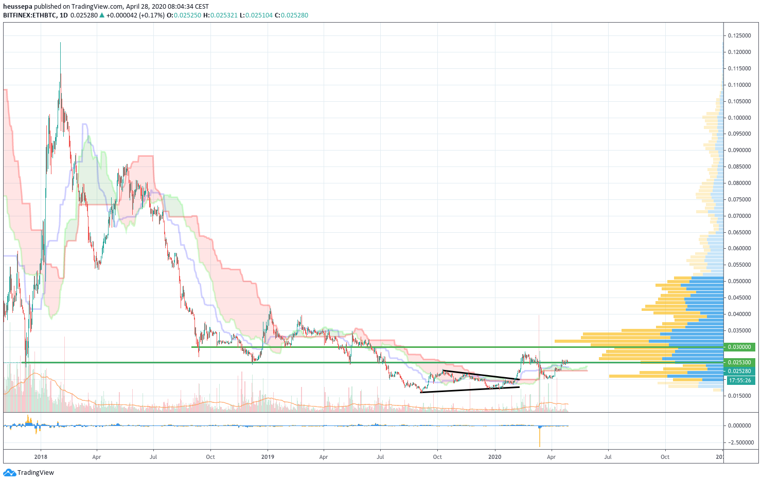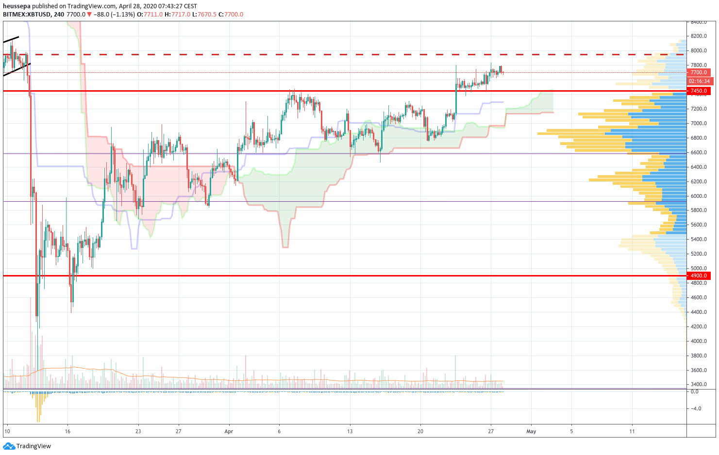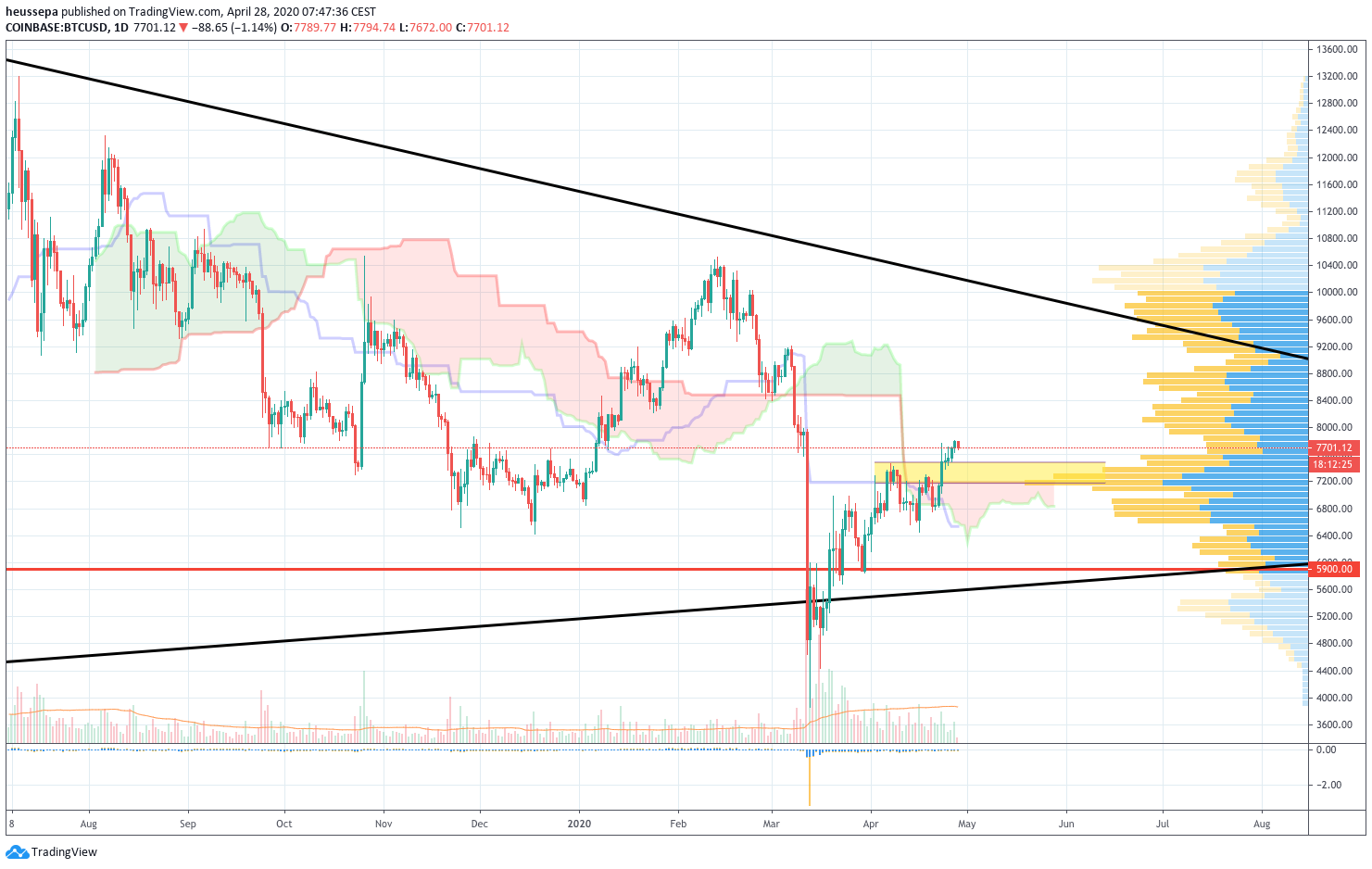 Auf dem Tages-Chart ist es viel deutlicher zu erkennen, dass wir endlich zu einem potentiell bullischen Setup durchgebrochen sind. Der gelbe Teil ist der 6,9-7,5k-Bereich, der auch mit dem oberen Band der Ichimoku-Wolke übereinstimmt. Das bedeutet, dass der erste Schritt nun getan ist und der Preis sich oberhalb dieses Bereichs halten muss, um die Wolke von einer Baisse in eine Aufwärtsbewegung zu verwandeln.