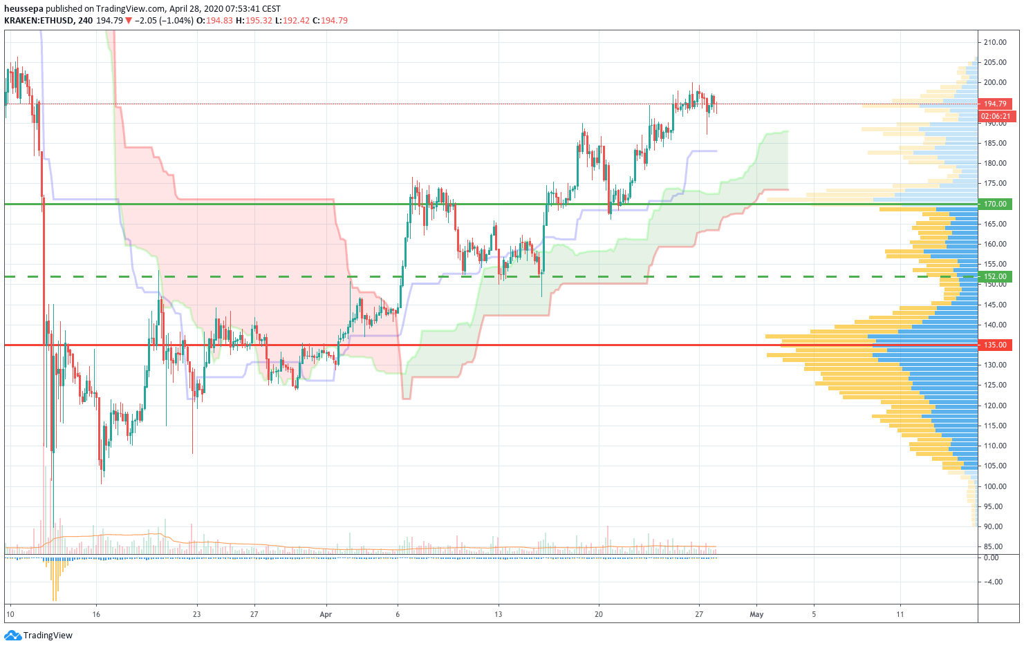 Zumindest enttäuschte ETH nicht. Unser Handel brachte uns leichte 10% Gewinn, ohne zu schwitzen (der Preis ist nie unter unser Einstiegsniveau gefallen).