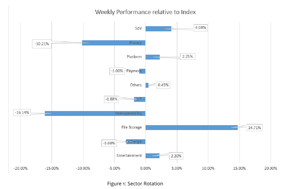 Die Sektoren mit der besten Performance sind File Storage, Store of Value und Platform. Die unterlegenen Sektoren sind Interoperability und Privacy. Alle anderen Sektoren entwickelten sich parallel zum Index.