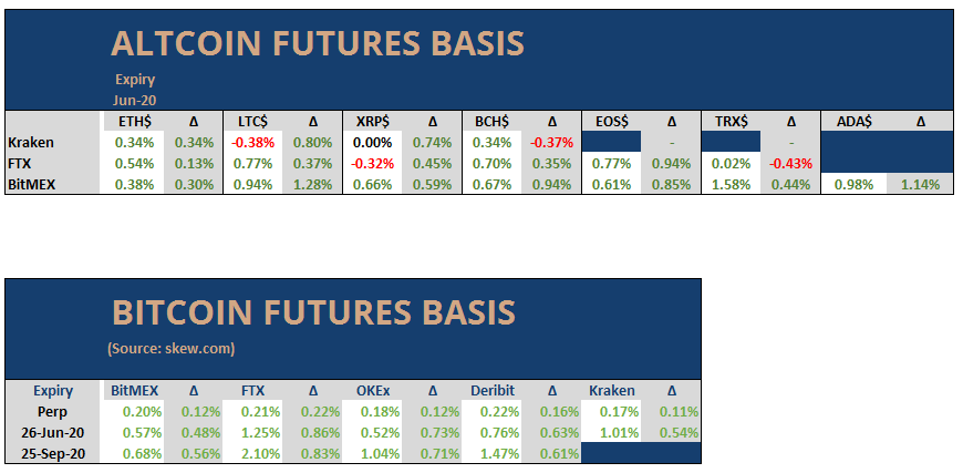 Der Handel auf Futures-Basis änderte sich innerhalb von 24 Stunden. Im Allgemeinen werden im Moment alle Futures in Contango gehandelt. Die Juni-Futures-Basis von BTC wird je nach Börse mit einem Aufschlag von 1% und die September-Futures-Basis mit einem Aufschlag von 2% gehandelt. Die Altcoin-Futures folgten dieser Entwicklung und werden neutral oder mit einem leichten Aufschlag gehandelt. Der Tagesgeldsatz stieg auf fast 10 Basispunkte.