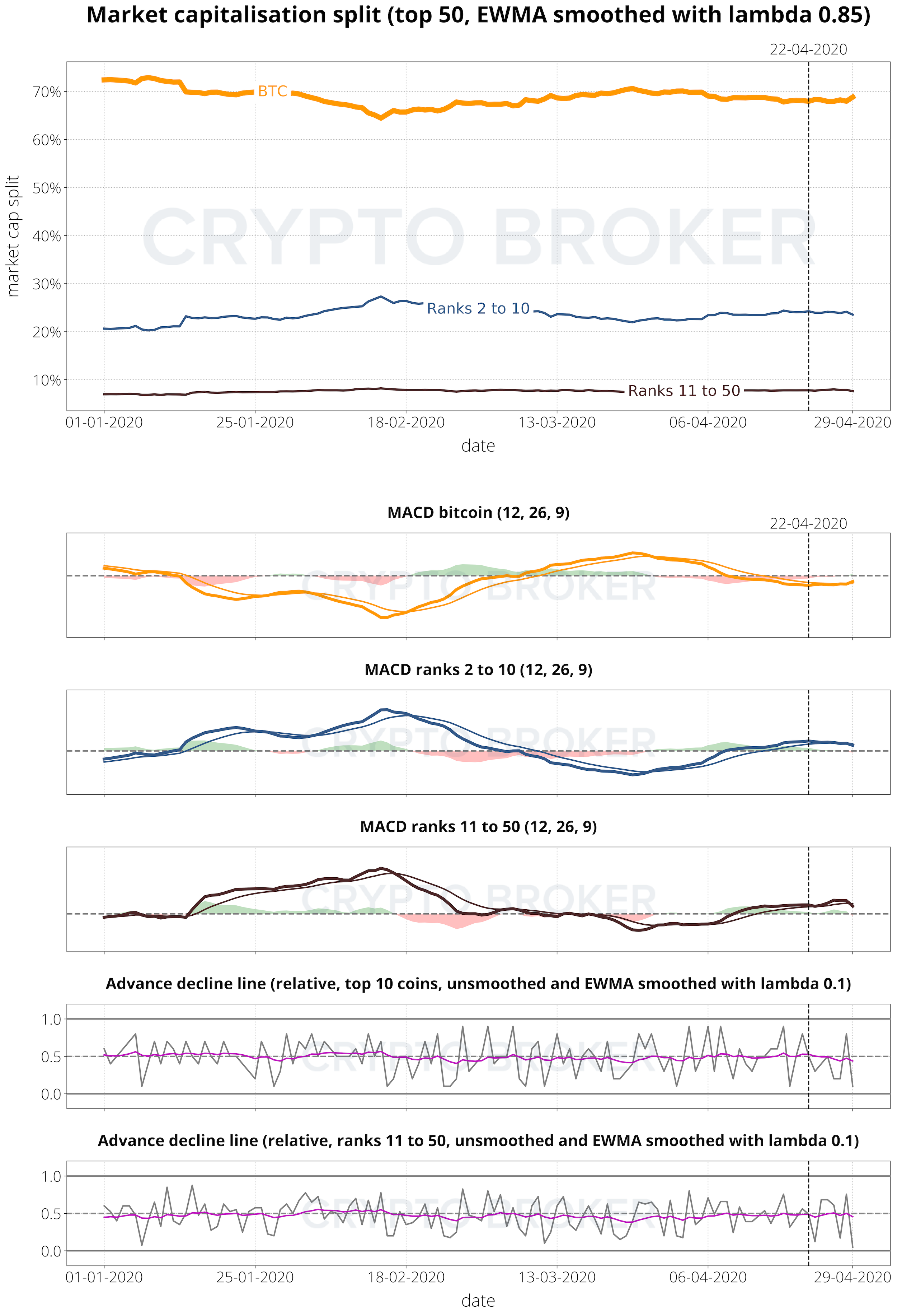 Die MACDs für BTC befinden sich immer noch in der neutralen Zone. Coins zwischen 2 und 50 bleiben neutral, bewegen sich aber leicht in die überkaufte Zone. Insgesamt deuten die MACDs immer noch auf ein neutrales Szenario hin.