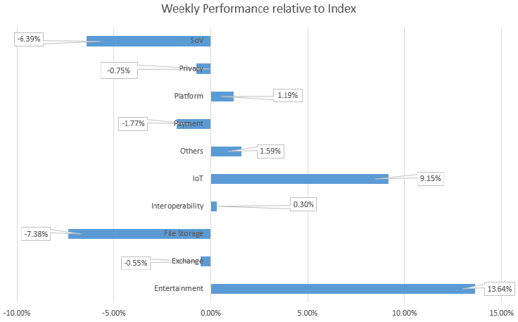 Der Sektor mit der besten Performance ist der Entertainmentsektor. Ein weiterer Gewinner ist der IoT-Sektor. Verlierende Sektoren sind File Storage, SoV und Exchange. Die übrigen Sektoren entwickelten sich neben dem Index.