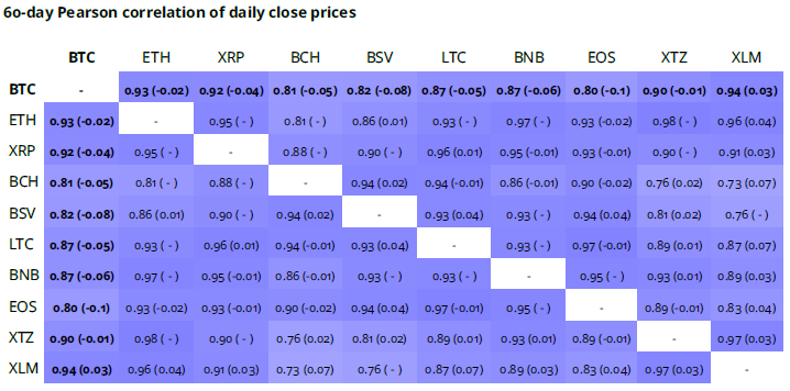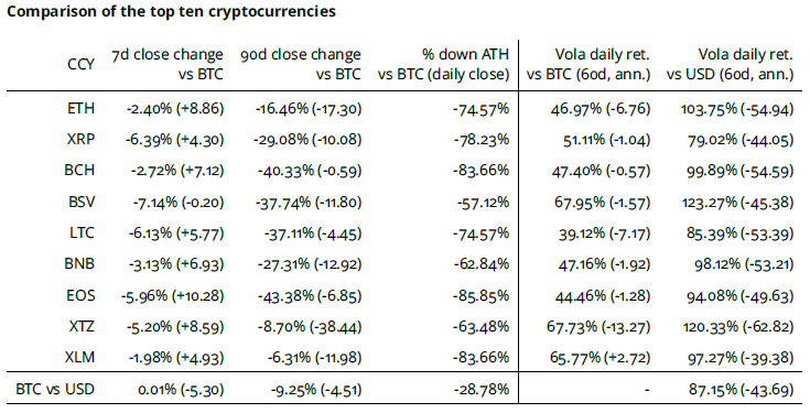 Die Dominanz des Bitcoin gegenüber den Altcoins hält an, obwohl es ein gewisses Interesse an einigen wenigen ausgewählten Coins gegeben hat, z.B. LINK, BAT und ENJ gegenüber BTC.