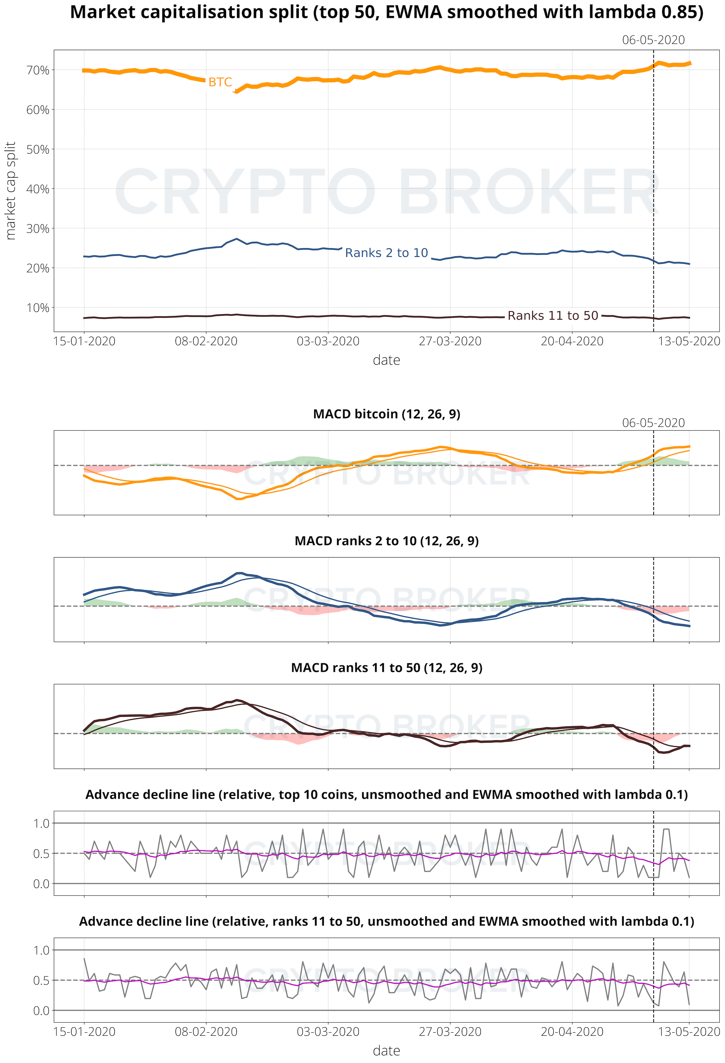 Advance Decline – Die Advance Decline Linie zeigt das Verhältnis der Coins, bei denen die Marktkapitalisierung im Vergleich zur Marktkapitalisierung von BTC für jeden Tag gestiegen ist.
