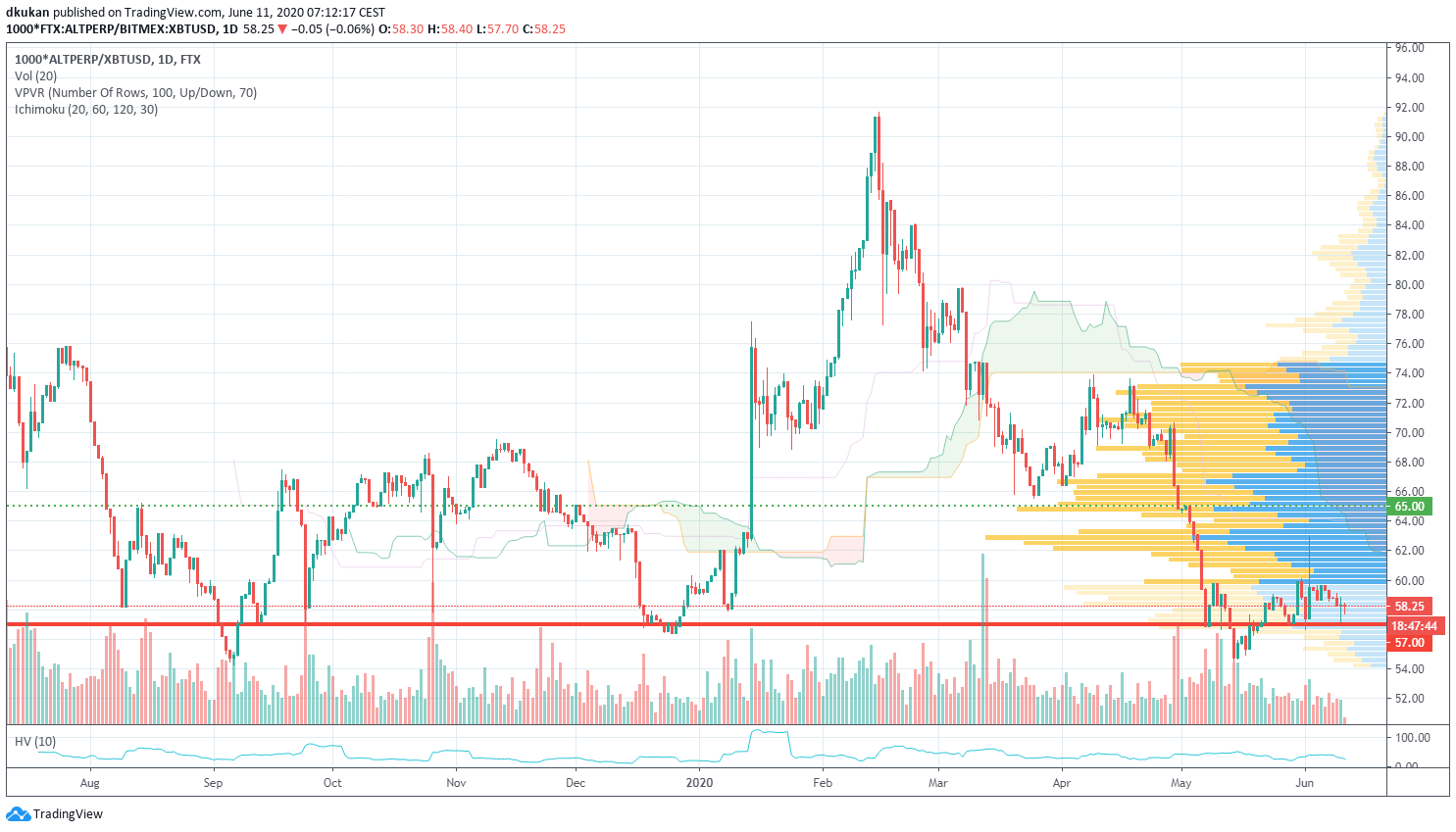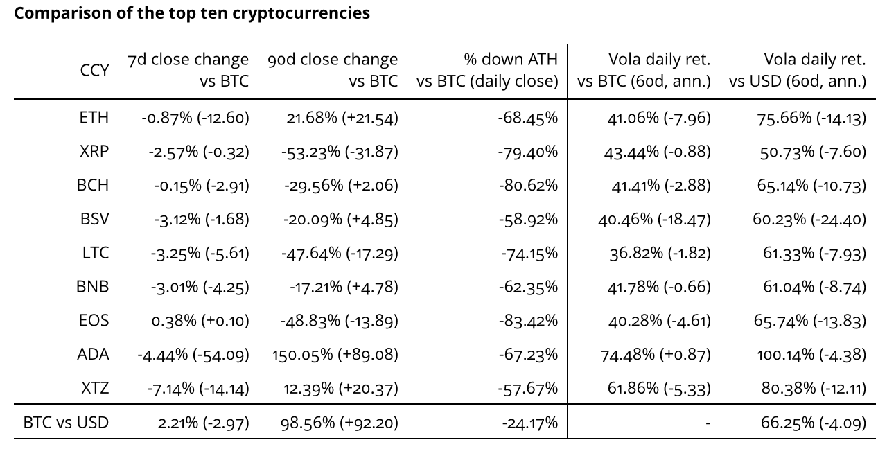 Die Coins mit der besten Performance sind erneut Bestandteil des Shit-Index. KNC, LRC und ZIL verzeichneten eine USD-Performance von 58%. Nur einige wenige Coins aus dem Universum des FTX-Index entwickelten sich negativ, wie z.B. THETA mit einem Minus von 13% und GRIN mit einem Minus von 7%. Die Coins aus dem Alt-Index haben sich nicht wesentlich verändert und entwickelten sich mehr oder weniger parallel zum Index.
