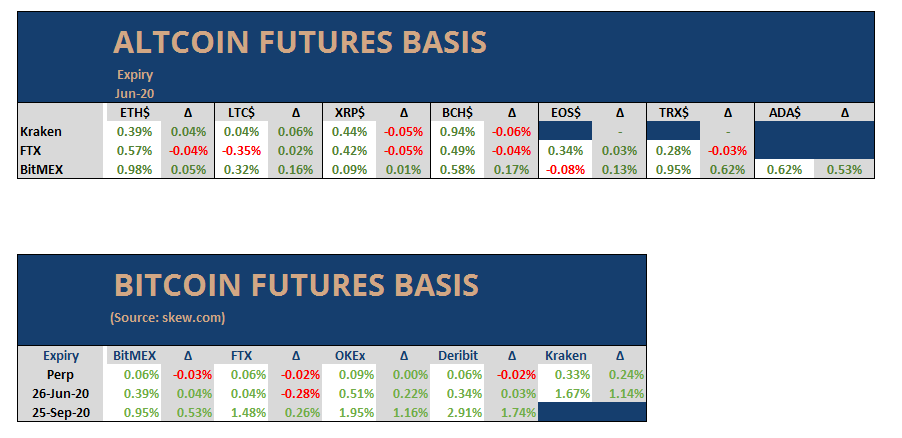 Die Futures-Basis hat sich in den letzten Handelstagen leicht erhöht. Die Futures-Basis für den Juni wird mit einem Aufschlag zwischen 0,5% und 1% gehandelt. Die Terminkontrakt-Basis für September wird mit einem Aufschlag zwischen 1,5% und 2,0% gehandelt. Die Refinanzierungssätze haben sich im Allgemeinen nicht wesentlich verändert und liegen weiterhin zwischen 5 und 10 Basispunkten. Das gesamte Handelsvolumen steigt bis zum nächsten Verfall stetig an.