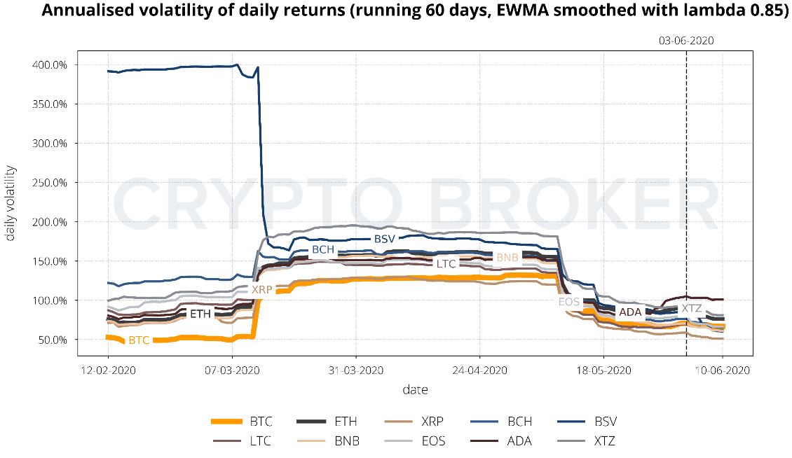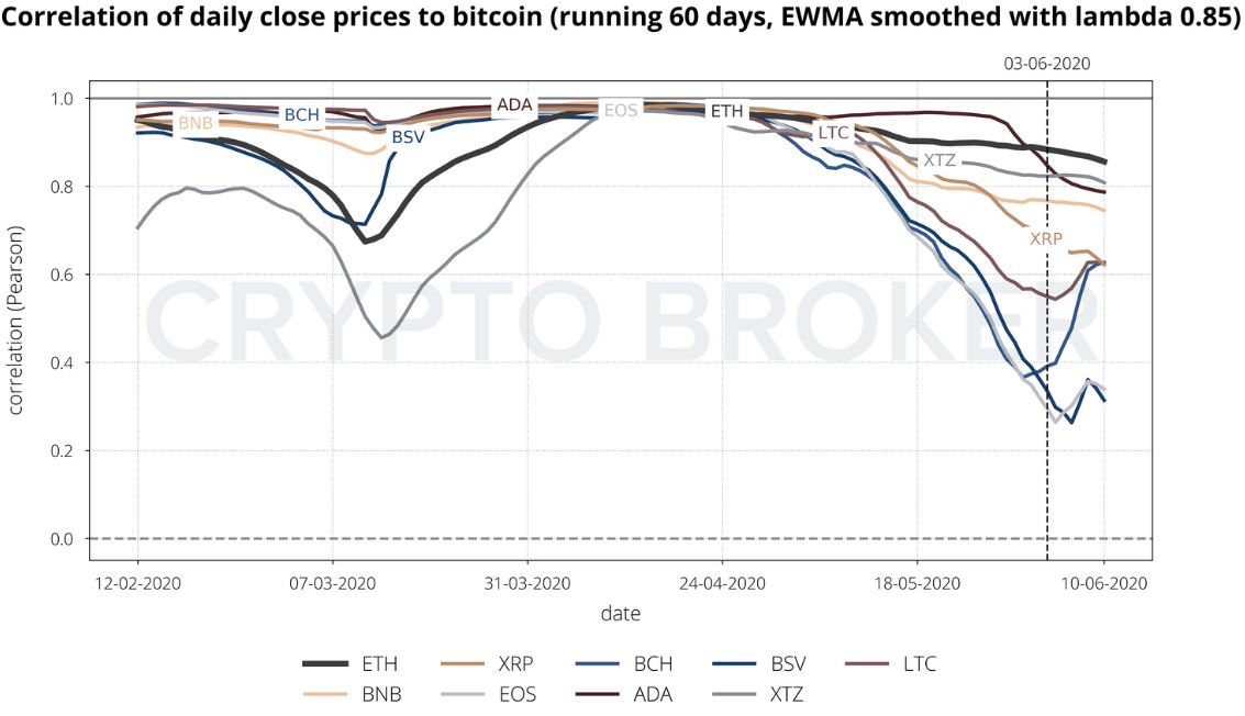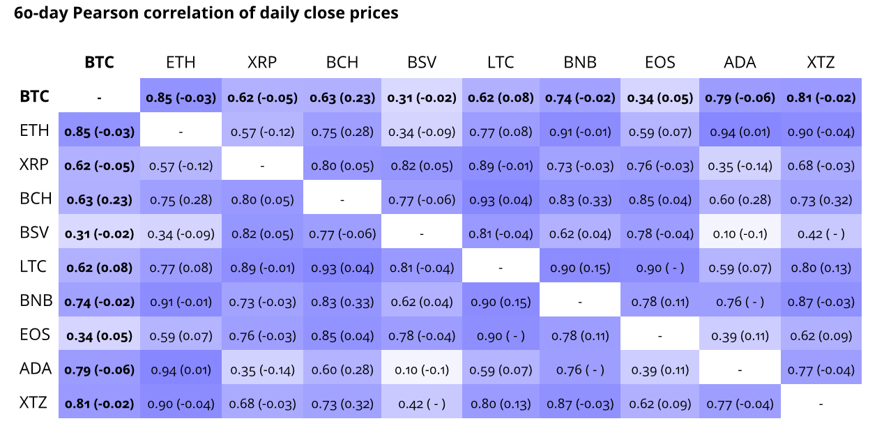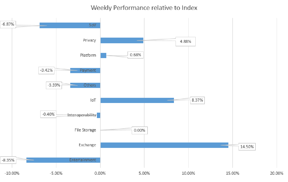 Es gibt nur wenige Sektorgewinner: Die Performance des Börsensektors liegt bei 15%, Internet of Things bei 9% und Privacy bei 5% über dem Index. Die unterlegenen Sektoren waren Unterhaltung mit einem Minus von 9%, Store of Value mit 7% und Payment mit 4%. Die übrigen Sektoren handelten neutral.
