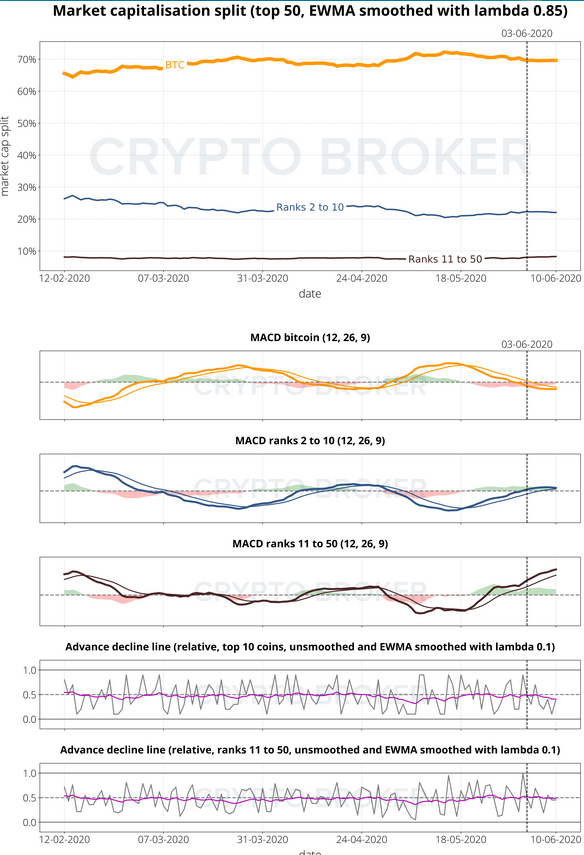 Advance Decline – Die Advance Decline Linie zeigt das Verhältnis der Coins, bei denen die Marktkapitalisierung im Vergleich zur Marktkapitalisierung von BTC für jeden Tag gestiegen ist.