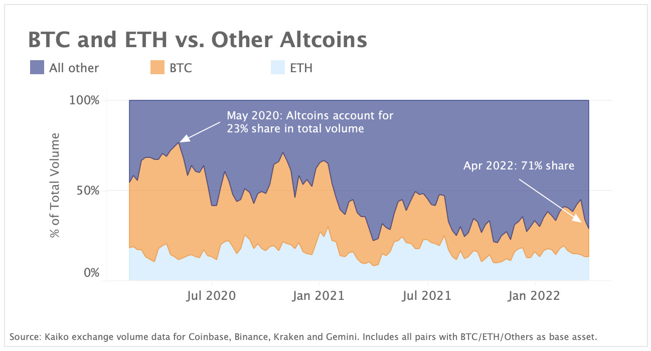 Während Bitcoin die meisten Altcoins inmitten der Makro-Volatilität der letzten Monate überflügelt hat, ist sein Marktanteil im letzten Jahr deutlich zurückgegangen und liegt nach wie vor deutlich unter seinem Durchschnitt für 2020. Wir stellen den Marktanteil des Volumens für alle Handelspaare an vier Börsen dar - Binance, Coinbase, Kraken und Gemini. Wir stellen fest, dass der Anteil der Altcoins (ohne Ethereum) in den letzten zwei Jahren von 23% auf 71% gestiegen ist, was auf eine dauerhafte Veränderung der Marktstruktur hindeutet. Bitcoin und Ethereum sind nach wie vor die bei weitem liquidesten Kryptowährungen und bieten den einfachsten Einstieg in die Kryptomärkte. Eine wachsende Zahl von Anlegern sucht jedoch nach einem breiteren Engagement in diesem Sektor, was sowohl durch den wachsenden Marktanteil an zentralisierten Börsen als auch durch die Zunahme von auf Altcoins ausgerichteten Anlageinstrumenten deutlich wird.