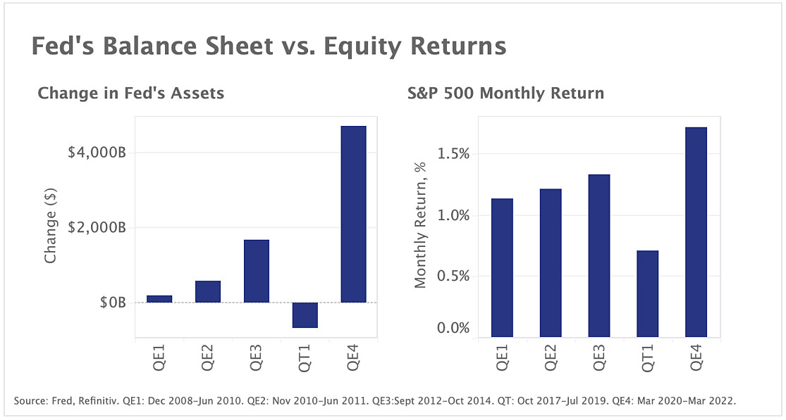 Risikoanlagen haben im Laufe der Jahre stark von der reichlich vorhandenen Liquidität der Zentralbanken profitiert und scheinen nach dem Beginn der quantitativen Straffung etwas an Zugkraft zu verlieren. Die durchschnittlichen monatlichen Renditen von US-Aktien waren während der vorangegangenen QT-Periode im Vergleich zu QE um etwa 50% niedriger, obwohl der Prozess von der Fed weithin angekündigt und vom Markt eingepreist wurde.