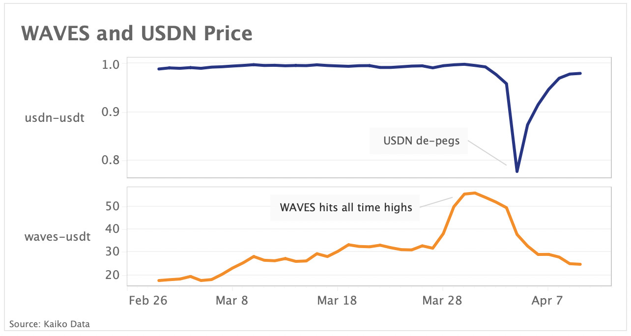 USDN ist mit WAVES besichert und verlässt sich auf Arbitrageure, um seine Bindung aufrechtzuerhalten, ähnlich wie der algorithmische Stablecoin TerraUSD (UST), der mit Luna besichert ist. Ein anonymer Twitter-Nutzer behauptete, dass das Waves-Blockchain-Team den Preis von WAVES manipulierte, indem es USDN als Hebel einsetzte. Dies führte zu Gegenbehauptungen des Gründers des Blockchain-Netzwerks, in welchen er behauptete, dass Alameda Research - der Handelsarm von FTX - WAVES manipulierte und Kampagnen organisierte, um Panikverkäufe auszulösen.