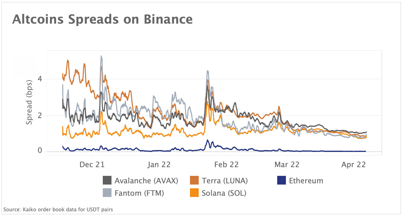 Altcoins sind immer noch deutlich weniger liquide als BTC- und ETH-Paare an den grössten globalen Börsen, aber wir können in den letzten Monaten eine Verbesserung für USDT-Paare auf Binance beobachten. Wir haben die Geld-Brief-Spanne für eine Handvoll Token grafisch dargestellt, um eine Vorstellung davon zu bekommen, wie sich die Liquidität im Vergleich zu Ethereum entwickelt hat. Seit Dezember 2021 sind die Spreads für LUNA um die Hälfte und die Spreads für AVAX und FTM um einen Basispunkt gesunken. Die Spreads von SOL sind relativ unverändert geblieben. Der Anstieg der Spreads für alle Krypto-Assets Ende Januar war auf einen Ausverkauf an den Kryptomärkten zurückzuführen.