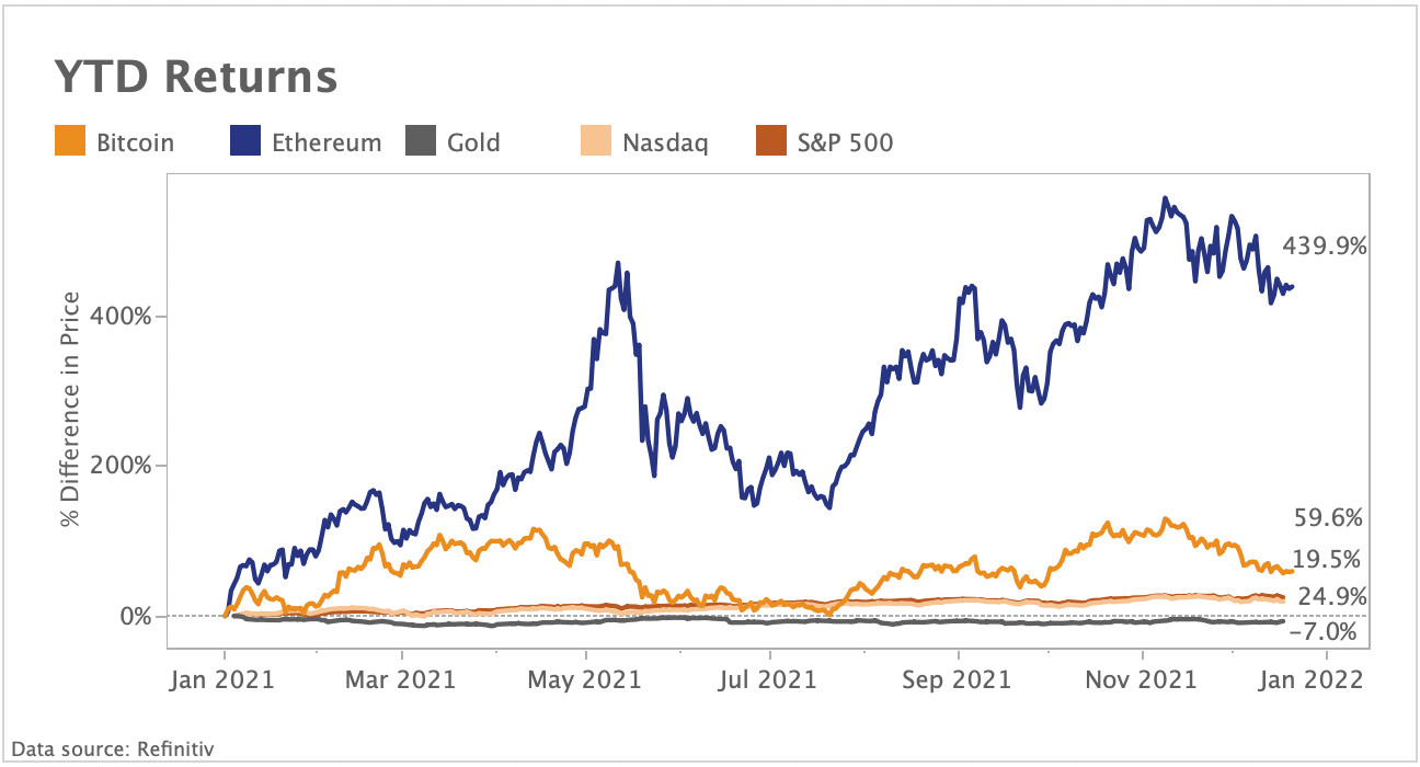 Trotz der Baisse im Dezember haben Kryptoanlagen im Vergleich zu traditionellen Finanzanlagen immer noch die mit Abstand besten Renditen. Ethereum ist mit einem Plus von 440% der Gewinner des Jahres, während Bitcoin mit +60% relativ mickrig abschneidet. Am schlechtesten schnitt Gold ab, das trotz globaler Inflationssorgen negative Renditen verzeichnete. Nach traditionellen Massstäben erzielten Aktien immer noch eine herausragende Performance und erreichten dabei zahlreiche neue Höchststände.
