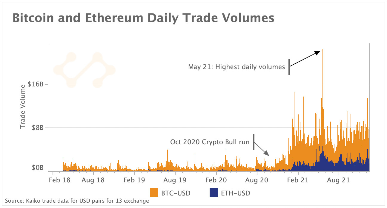 Im Januar 2021 begannen zahlreiche Unternehmen, Fonds und hochkarätige Investoren massenhaft Kryptowährungen zu kaufen, was zu einer beispiellosen Hausse beitrug, die den Bitcoin über 60'000 Dollar steigen liess. Die Börsen ermöglichten Transaktionen in Rekordhöhe und trotz einer leichten Stagnation seit Mai sind die Volumina immer noch um ein Vielfaches höher als in den Vorjahren. Der Börsengang von Coinbase, die massiven Marketinginitiativen von FTX und die anhaltende Dominanz von Binance haben die Börsen zu globalen Giganten gemacht.