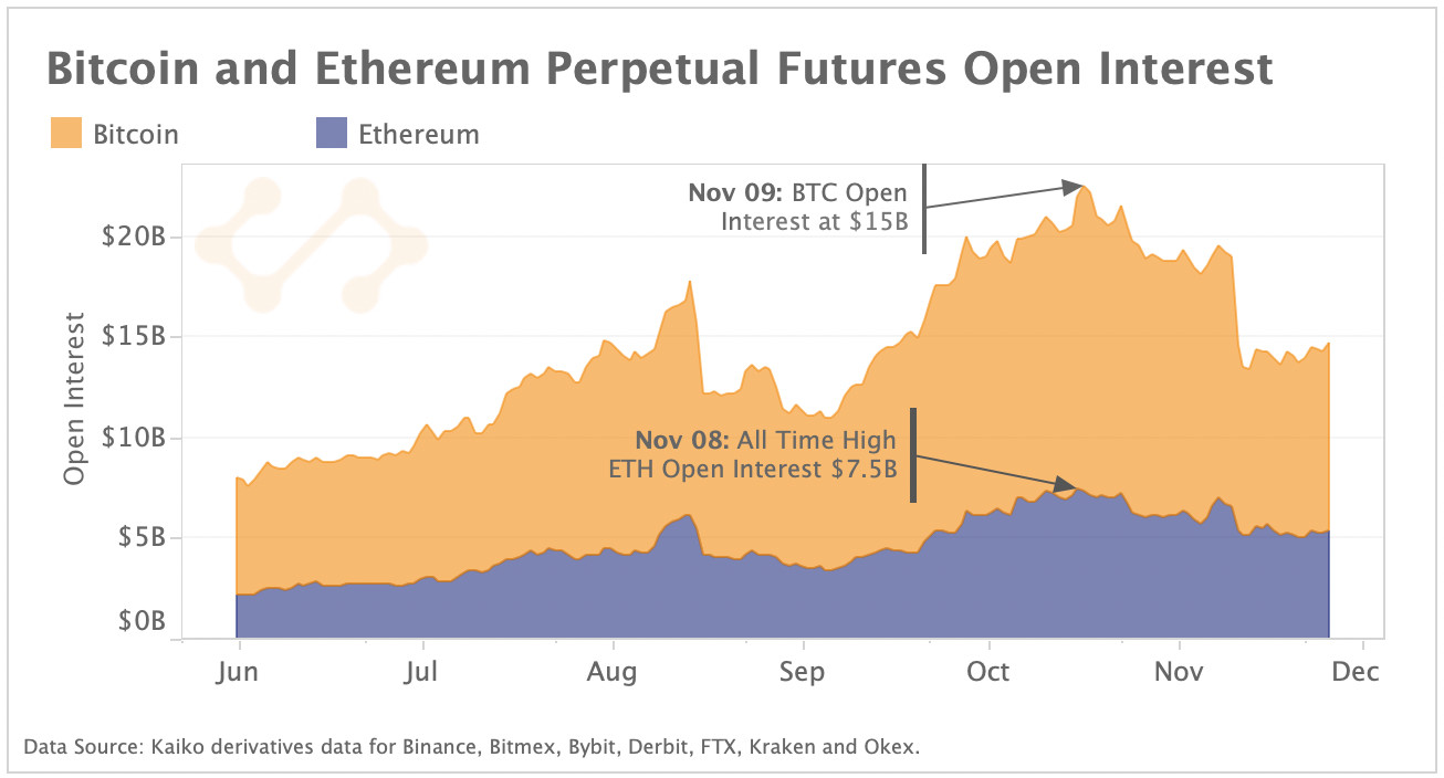Während Derivate den Preisfindungsprozess auf den Kryptowährungsmärkten drastisch verbessert haben, hat der übermässige Einsatz von Hebeln immer wieder zu grossen Kurseinbrüchen beigetragen. Im Jahr 2021 schränkten viele Börsen als Reaktion auf die zunehmende Aufsicht der Regulierungsbehörden zum ersten Mal die Hebelwirkung ein, was mit der Zeit die Anzahl der Liquidationskaskaden verringern könnte. Das Open Interest an BTC- und ETH-Futures erreichte im Laufe des Jahres trotz der neuen Beschränkungen neue Höchststände. Insbesondere Ethereum verzeichnete steigende Investitionen von Derivatehändlern, obwohl das Open Interest immer noch ~1/3 desjenigen von Bitcoin beträgt.