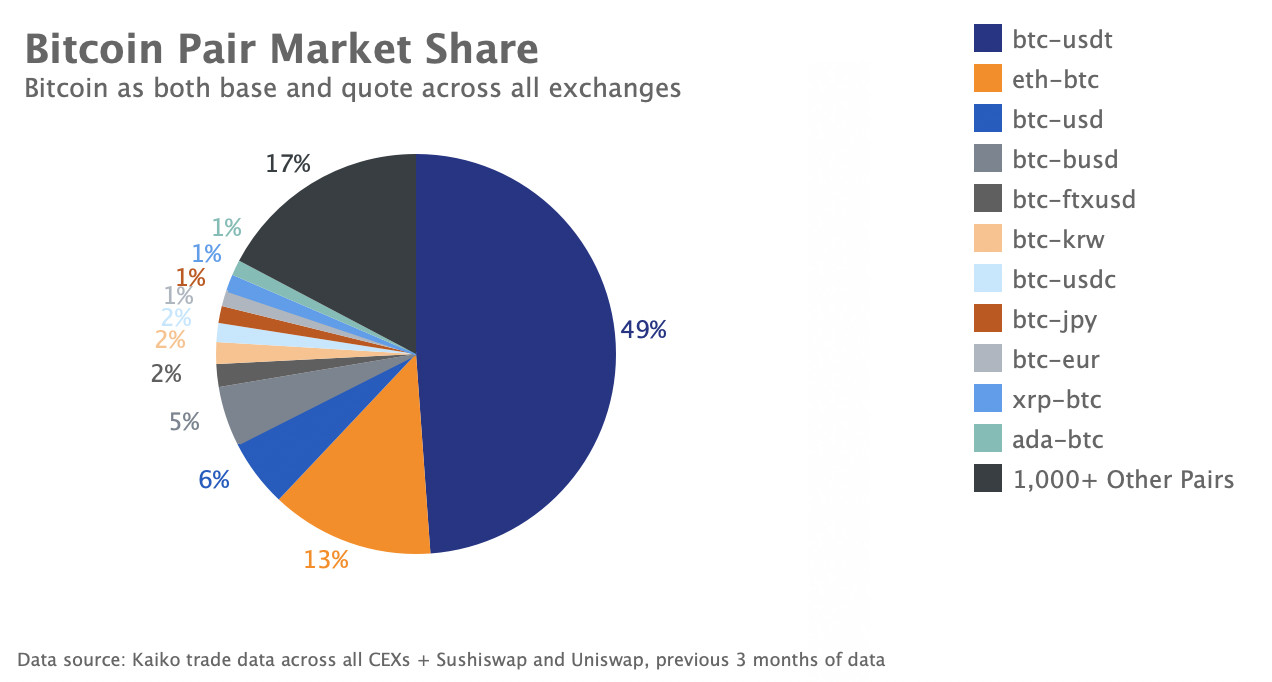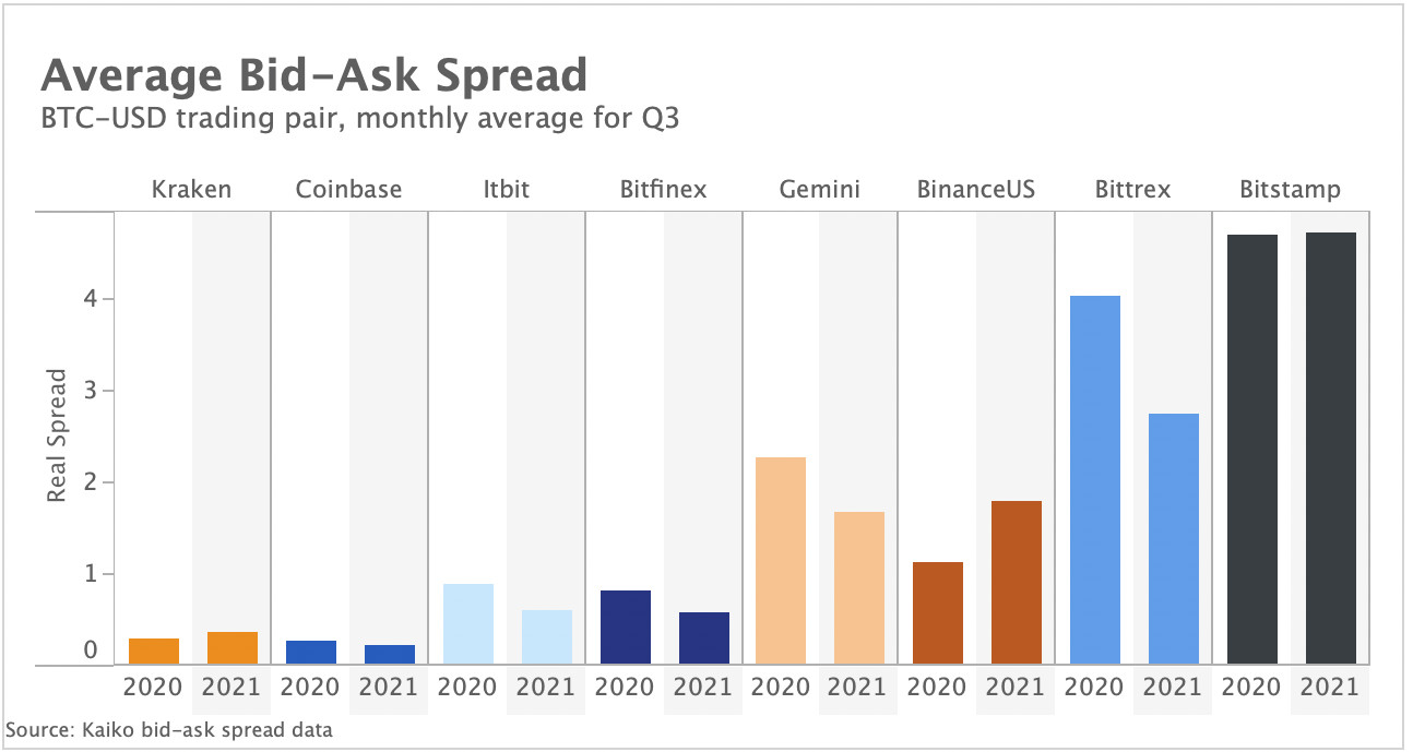 Liquidität ist ein schwieriges Thema auf den Kryptowährungsmärkten, welche über Hunderte von Kryptowährungen und Dutzende von Börsen stark fragmentiert sind. Die Geld-Brief-Spanne ist eine der zuverlässigsten Messgrössen für die Liquidität, erfasst aber nicht die ganze Geschichte, da die Market-Maker-Gebühren von Börse zu Börse erheblich variieren. Vergleicht man jedoch den Liquiditätsunterschied zwischen Q3 2020 und Q3 2021 für BTC-USD-Handelspaare, kann man feststellen, dass sich der durchschnittliche Spread an den meisten Börsen verringert hat, was ein gutes Zeichen ist. Die Liquidität ist nach wie vor ein Problem für Altcoin-Paare, die oft Schwierigkeiten haben, eine ausreichende Tiefe zu erreichen.