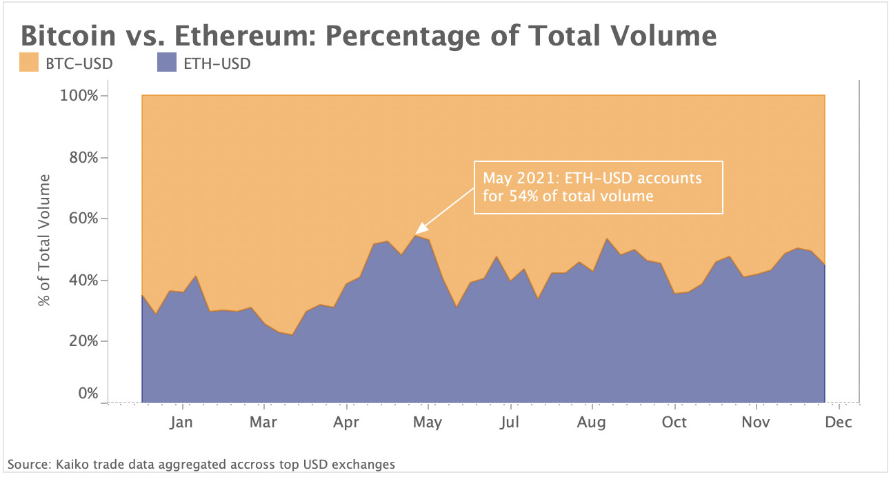 2021 war das Jahr, in dem die Anleger begannen, Ethereum ernst zu nehmen. Während ein "Flippening" der Marktkapitalisierung noch in weiter Ferne liegt, hat sich der Marktanteil des Handelsvolumens bei zahlreichen Gelegenheiten geändert. Zu mehreren Zeitpunkten entfielen mehr als 50% des täglichen Handelsvolumens auf Ethereum - ein starkes Zeichen dafür, dass die Anleger eine Diversifizierung über Bitcoin hinaus anstreben.