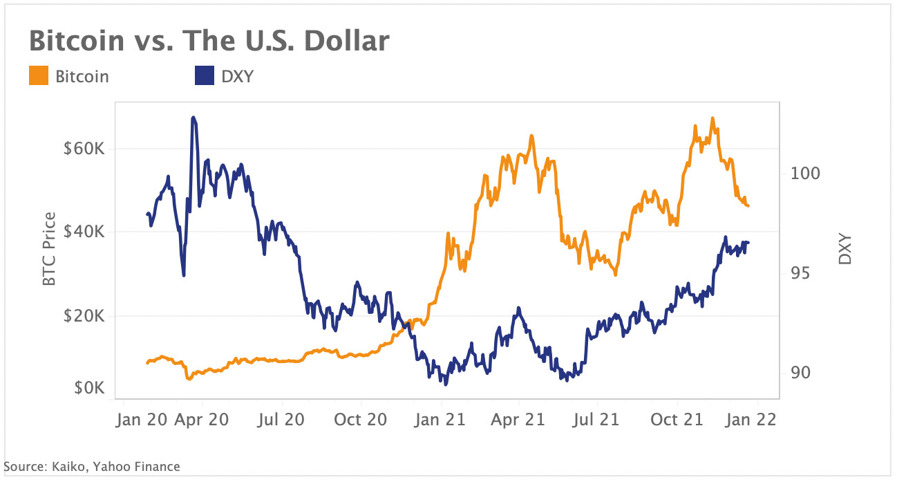 Während des gesamten Jahres 2020 bestand zwischen Bitcoin und dem US-Dollar eine starke umgekehrte Korrelation. Die durch die Pandemie ausgelöste Wirtschaftskrise und die anschliessenden geldpolitischen Stimuli, liessen den DXY (USD-Index) abstürzen, während Bitcoin auf neue Allzeithochs stieg. Im Jahr 2021 löste sich diese Korrelation weitgehend auf, bis vor kurzem, als der Dollar stark zulegte, während Bitcoin eine rückläufige Entwicklung nahm. Ein steigender Dollar kann Druck auf risikoreichere Vermögenswerte wie Krypto- und Schwellenländerwährungen ausüben, weshalb der Trend als Indikator für die Marktstimmung dienen könnte.