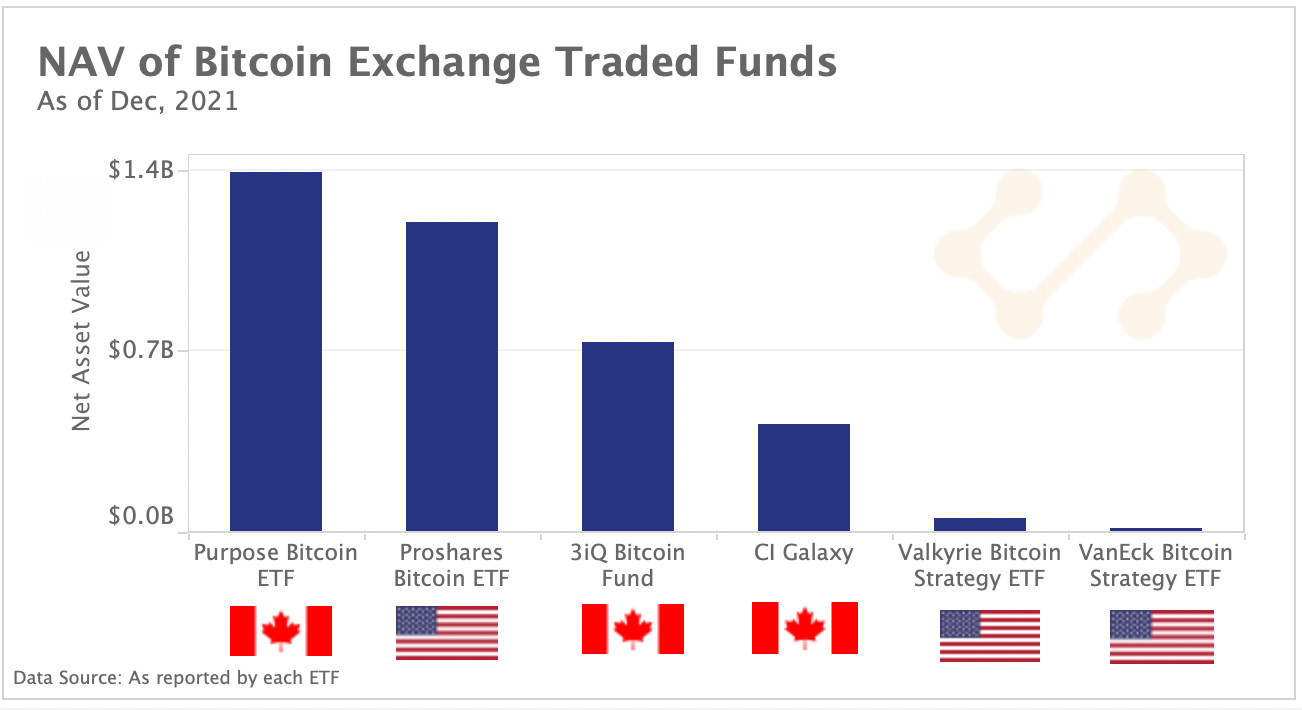 Die Genehmigung des ersten Bitcoin-ETF in den Vereinigten Staaten war ein historischer Meilenstein für die Kryptowährungsbranche, auf den fast ein Jahrzehnt gewartet wurde. Der ProShares BITO ETF - der den Bitcoin-Futures-Handel an der Chicago Mercantile Exchange abbildet - erzielte an den ersten beiden Handelstagen ein Handelsvolumen von mehr als 1 Milliarde US-Dollar und überschritt damit fast das von der CME für ein einzelnes Unternehmen festgelegte Kontraktkauflimit. Zwei weitere börsengehandelte Fonds wurden nacheinander aufgelegt, der ProShare-Fonds jedoch, gemessen am Nettoinventarwert (NAV), nach wie vor den Vorteil des Erstanbieters geniesst. Kanada war das erste Land, das Anfang des Jahres einen Bitcoin-Spot-ETF genehmigte, der nach wie vor das beliebteste Anlageinstrument ist.