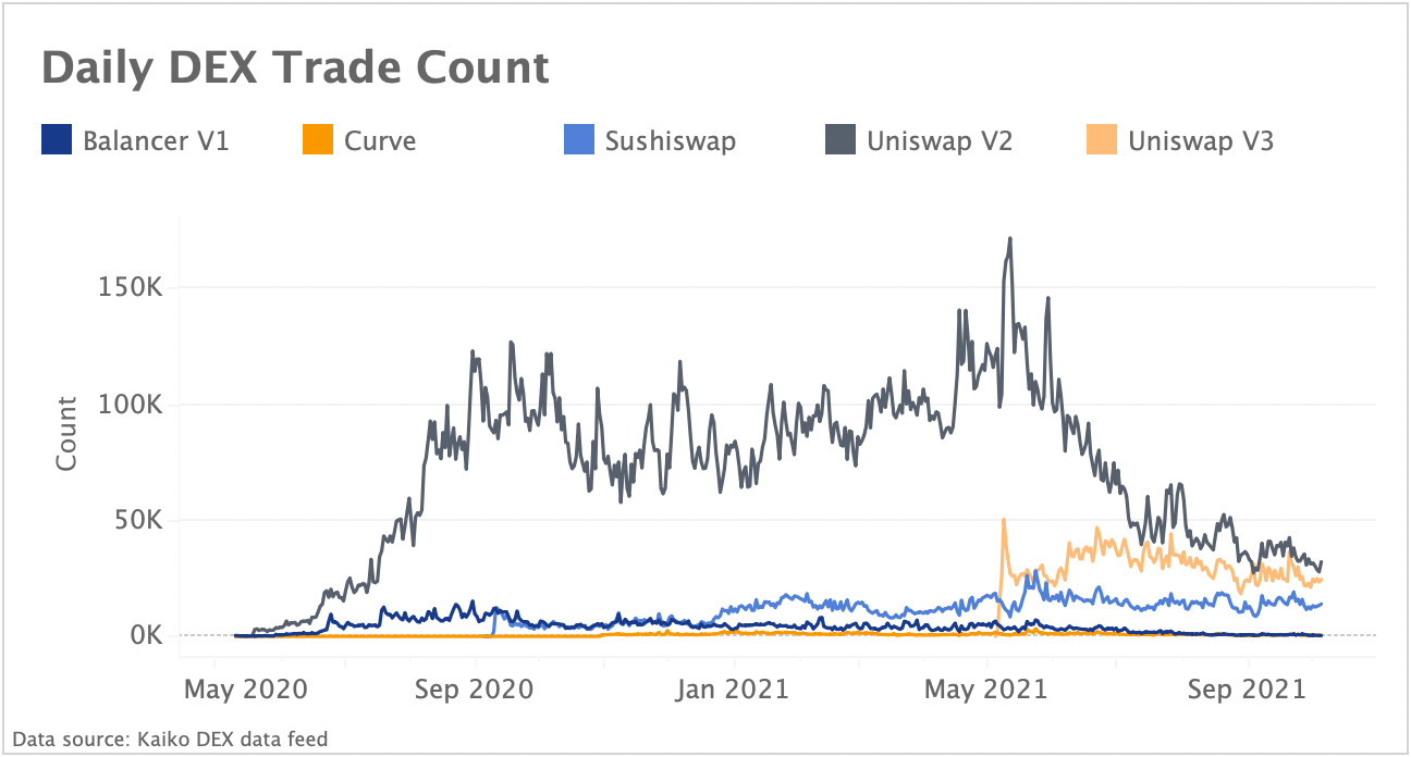 In DeFi verrät die Anzahl der Transaktionen oft viel mehr über die Nutzung eines Protokolls als das Handelsvolumen, welches durch einige wenige Wale verzerrt werden kann. Heute wickeln die führenden Ethereum DEXs weniger als 50'000 Transaktionen pro Tag ab. Die Anzahl der Transaktionen ist während des grössten Teils des Jahres 2021 gleich geblieben, während das Volumen gestiegen ist. Dies ist grösstenteils auf die rekordverdächtig hohen Gebühren im Ethereum-Netzwerk zurückzuführen, welche Transaktionen für Kleinhändler wirtschaftlich unrentabel machen.