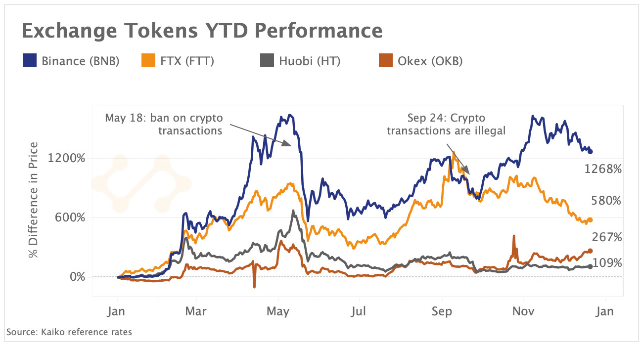 Im September verbot China offiziell alle Kryptowährungstransaktionen, nachdem es bereits im Mai ein sanftes Verbot ausgesprochen hatte. Das hat Wellen in der gesamten Branche geschlagen. Bitcoin-Miner waren gezwungen, ihre Geschäfte zu schliessen und die Börsen mussten das Land komplett verlassen. Binance, Okex, FTX und Huobi haben in der Vergangenheit eine asiatische Nutzerbasis bedient und das Verbot liess die von den Börsen ausgegebenen Token abstürzen. Die Börsentoken haben sich grösstenteils erholt und sind für 2021 immer noch im grünen Bereich, obwohl die vollen Auswirkungen des Verbots wahrscheinlich erst in einiger Zeit zu spüren sein werden.