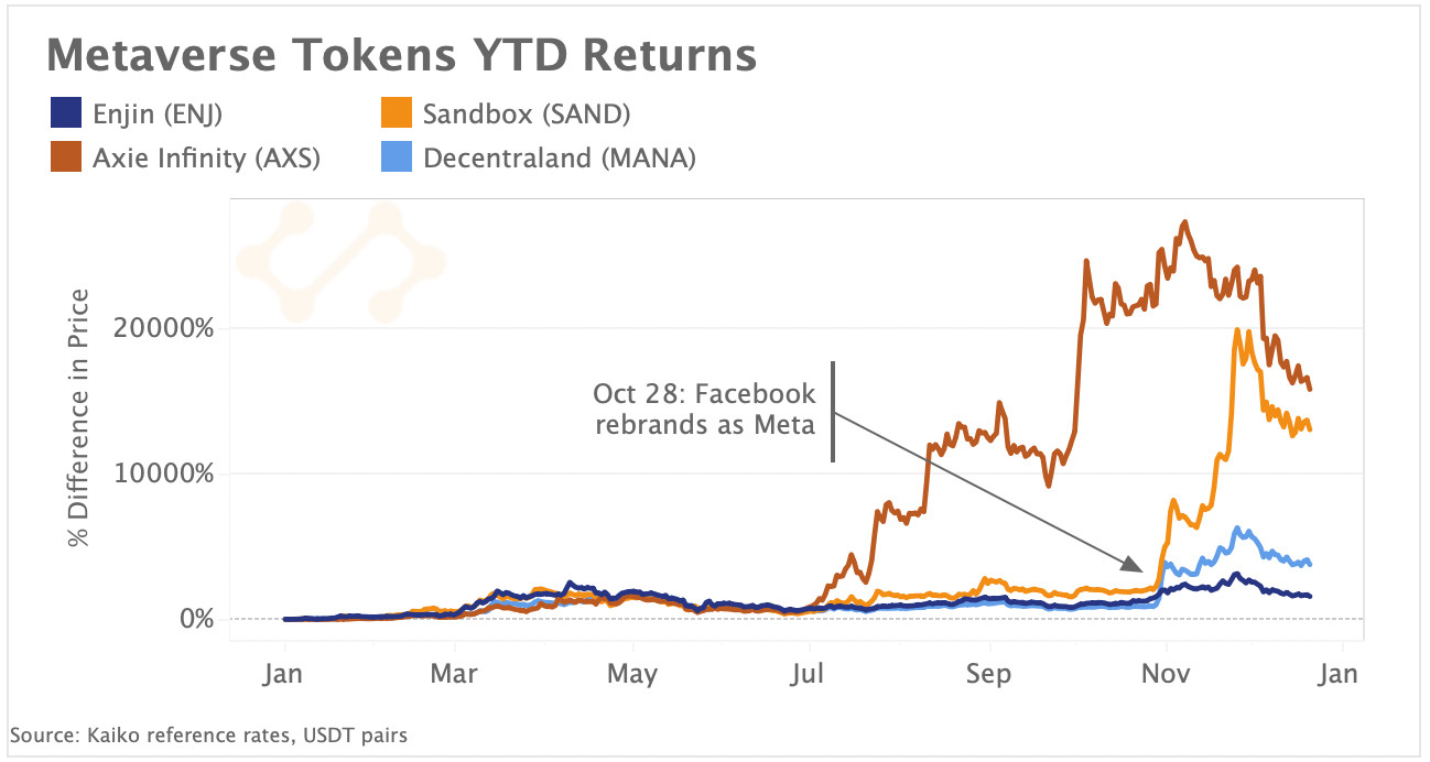 Facebooks grosses "Meta"-Rebranding erwies sich als äusserst positives Signal für mehrere der grössten NFT-Projekte, die in praktisch allen kulturellen Mainstream-Segmenten für Aufmerksamkeit sorgten. NFT- und Metaverse-Plattformen sind angesagter denn je und die mit ihnen verbundenen Token verzeichneten im Jahr 2021 massive Renditen, allen voran Axie Infinity und Sandbox. Angesichts der rekordverdächtigen VC-Investitionen können wir davon ausgehen, dass dieser Sektor der Kryptoindustrie auch im neuen Jahr die Aufmerksamkeit des Mainstreams auf sich ziehen wird.