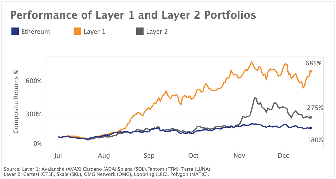 Das vielleicht grösste technische Problem für die Kryptowährungsbranche waren die rekordverdächtig hohen Transaktionsgebühren von Ethereum und die Überlastung des Netzwerks, die die Protokolle des Netzwerks praktisch unbrauchbar machten. Dies führte zu einer beispiellosen Begeisterung der Anleger für "Layer 1"- und "Layer 2"-Token. L1-Protokolle sind alternative Blockchain-Netzwerke, die oft als "Ethereum-Killer" bezeichnet werden, während L2-Protokolle Skalierungsdienste für die Ethereum-Blockchain sind, welche darauf ausgelegt sind, Transaktionen ausserhalb der Blockchain zu verarbeiten und Überlastungen zu reduzieren. Die Performance der fünf Top-Token in jeder Kategorie übertrifft die Renditen von Ethereum seit Q3 bei weitem, obwohl die tatsächliche Nutzung dieser Protokolle immer noch weitaus geringer ist.