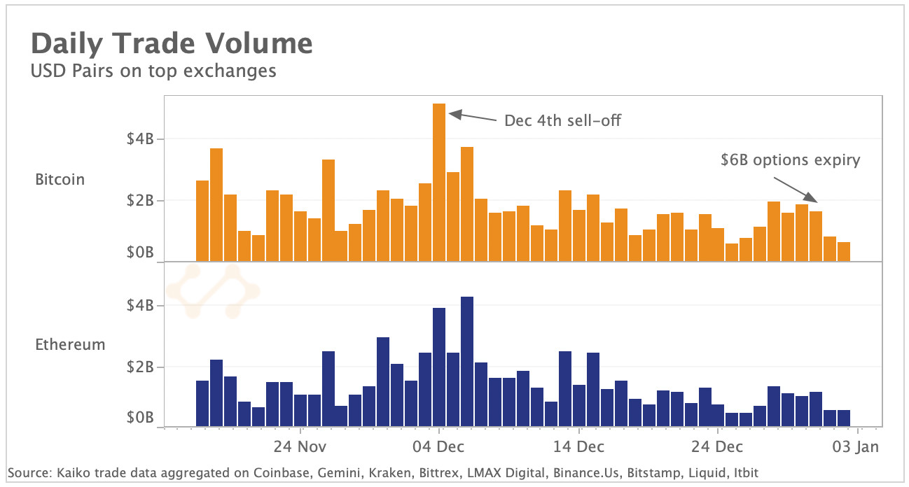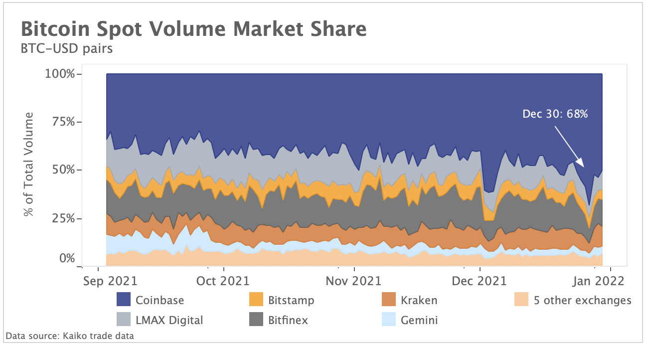 In den letzten Wochen des Dezembers machten die Händler grösstenteils Urlaub. Das durchschnittliche Bitcoin- und Ethereum-Volumen lag deutlich unter dem Durchschnitt des Novembers. Die Volumina von BTC-USD und ETH-USD überstiegen an den führenden Börsen kaum die Marke von 1.5 Mrd. Dollar, was mit starken Einbrüchen bei beiden Vermögenswerten einherging. Während die Volumina insgesamt relativ niedrig waren, haben wir in der letzten Dezemberwoche einen ungewöhnlichen Anstieg der Aktivitäten auf Coinbase festgestellt. Unten ist der Marktanteil des Volumens für die BTC-USD-Märkte über die verschiedenen Börsen hinweg grafisch dargestellt. Es ist zu erkennen, dass das Handelsvolumen auf Coinbase von 45% am 26. Dezember auf 68% am 30. Dezember anstieg, der höchste Anteil seit Jahren.