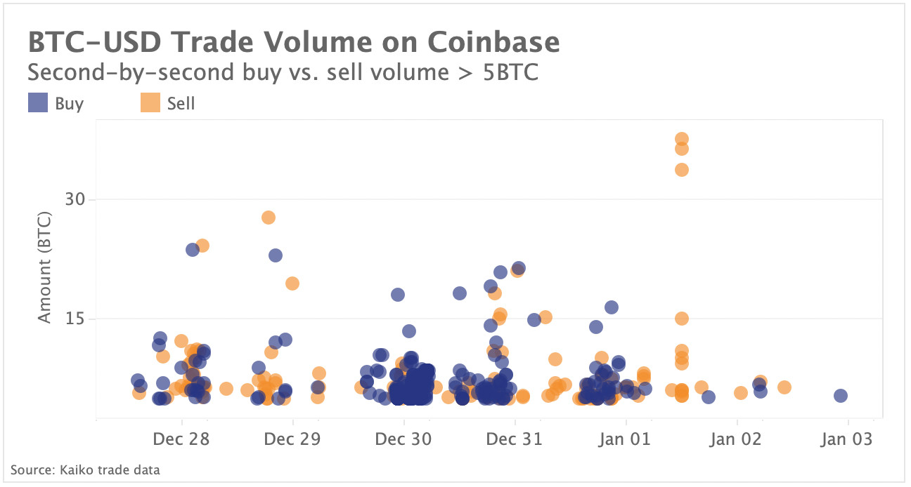 Es ist klar, dass ein Händler oder eine Handvoll Händler während dieses Zeitraums ungewöhnlich aktiv auf Coinbase waren. Unten stellen wir das sekündliche Volumen von Kauf- und Verkaufsaufträgen für alle Trades über 5 BTC dar, um einen Eindruck davon zu vermitteln, wie sich grosse Händler (Whales) verhielten. Am 30. Dezember, dem Tag des Anstiegs des Marktanteils, ist eine grosse Konzentration von Kaufaufträgen über 5 BTC zu beobachten. Unmittelbar vor dem Verfallstag der Optionen am 31. Dezember wurden eine Reihe grosser Kauf- und Verkaufsaufträge ausgeführt, und am 1. Januar war ein starker Anstieg der Verkaufsaufträge über 5 BTC zu beobachten.