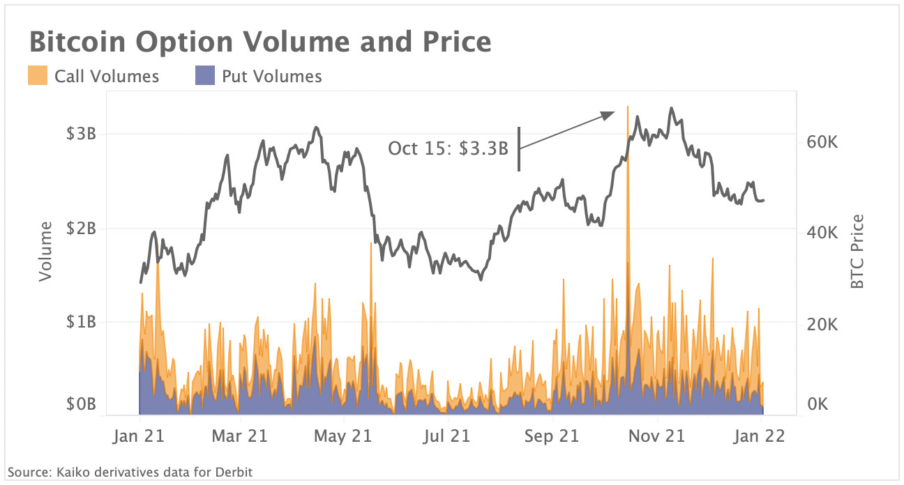 Das Volumen von Bitcoin-Optionen ist nach dem Jahreshoch im Oktober deutlich zurückgegangen, wobei das Volumen vor dem Verfallstermin am 31. Dezember relativ gering ist. Oben sehen Sie ein Diagramm des Put- und Call-Handelsvolumens auf Deribit, dem grössten Markt für Kryptowährungsoptionen, zusammen mit dem Bitcoin-Preis. Optionen sind eine Art von Derivatkontrakt, der das Recht - aber nicht die Verpflichtung - gibt, den zugrunde liegenden Vermögenswert zu einem festen Preis vor oder am Verfallsdatum zu kaufen. Analysten zufolge war der grosse Verfallstermin am 31. Dezember für die meisten Kauf-(Call-)Optionskontrakte eine der Triebfedern für die jüngsten Turbulenzen des Bitcoin-Kassakurses, da grosse Händler versuchten, den Kassakurs in Richtung des maximalen Schmerzpreises (engl. = max pain) zu drücken. Der maximale Schmerzpreis ist der Ausübungspreis mit den meisten offenen Kontrakten und wird auf 48'000 Dollar geschätzt. Da Bitcoin die vergangene Woche bei rund 47'000 Dollar beendete, mussten viele Inhaber von Kaufoptionen Verluste hinnehmen.