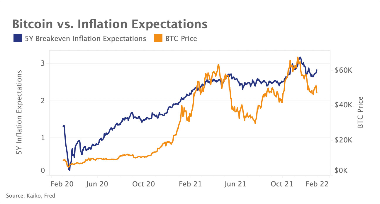 Die Breakeven-Inflationserwartungen - ein marktbasiertes Mass für die erwartete Inflation in den nächsten 5 Jahren - sind zurückgegangen, nachdem die US-Notenbank im November offiziell mit der Drosselung der monatlichen Wertpapierkäufe begonnen hat. Oben sehen Sie ein Diagramm der Inflationserwartungen und des Bitcoin-Preises. Wir stellen fest, dass sie sich im letzten Monat im Gleichschritt bewegt haben, obwohl sie Ende Dezember leicht voneinander abwichen. Die Inflationserwartungen, die Mitte November ein Mehrjahreshoch erreicht hatten, sind trotz des Auftretens des neuen Omicron-Covid-Stammes, der die Unterbrechung der Lieferkette verschärfen könnte, rückläufig. Letztere gehörten im vergangenen Jahr zu den wichtigsten Triebkräften für steigende Preise. Bitcoin fiel ebenfalls, nachdem er im November ein Allzeithoch erreicht hatte, da viele Anleger ihre Portfolios aufräumten und vor der Weihnachtszeit vorsichtig blieben.