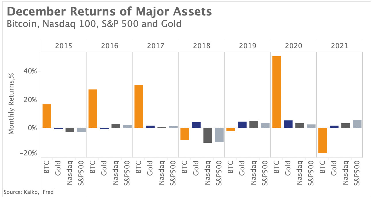 Die Kryptomärkte erlebten einen rückläufigen Dezember, während sich traditionelle Aktien und der sichere Hafen Gold erholten. Oben sehen Sie eine Grafik der Dezember-Renditen für die wichtigsten Finanzanlagen der letzten sechs Jahre. Der Dezember ist ein historisch starker Monat für die Aktienmärkte, wobei die wichtigsten Indizes während der so genannten Weihnachtsmann-Rallye (die letzten fünf Tage des Jahres und die ersten zwei Tage des Januars) überwiegend positive Renditen verzeichneten. Sowohl der S&P 500 als auch der technologieorientierte Nasdaq 100 beendeten den Monat das dritte Jahr in Folge im grünen Bereich. Bitcoin fiel um fast 20% und schloss das Jahr etwa 20'000 US-Dollar unter seinem Allzeithoch, was in starkem Kontrast zur Hausse von 2020 steht.