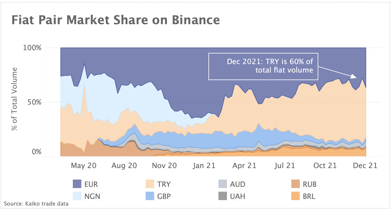 Die Akzeptanz von Kryptowährungen in der Türkei ist in den letzten Monaten inmitten eines Rekordeinbruchs der türkischen Lira (TRY) sprunghaft angestiegen. Heute ist Binance eine der einzigen grossen globalen Börsen, die Handelspaare in TRY anbietet. Insgesamt listet die Börse aufgrund regulatorischer Beschränkungen nur eine Handvoll Fiat-Währungen. Jahrelang war der höchste Prozentsatz des Volumens von Fiat-Währungspaaren in Euro denominiert, aber das änderte sich 2021. In der obigen Grafik ist der Marktanteil der wichtigsten Fiat-Währungen auf Binance dargestellt und es ist zu erkennen, dass der Anteil der Lira von nur 7% im Januar auf 60% des gesamten Fiat-Volumens im Dezember angestiegen ist. Im gleichen Zeitraum hat die Lira mehr als 40% ihres Wertes verloren, was zum Teil auf die unkonventionelle Geldpolitik des Landes zurückzuführen ist, die darauf abzielt, das Wachstum und die Exporte trotz steigender Inflation anzukurbeln.