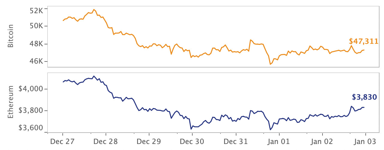 Die Liquidität ist über die Feiertage tendenziell geringer und die fehlende Handelsaktivität, sowie der Verfall von Optionen im Wert von 6 Mrd. US Dollar trugen wahrscheinlich zu dem Kursrückgang bei, den die Kryptowährungsmärkte in der vergangenen Woche erlebten. Obwohl das Jahr 2021 mit einer düsteren Note endete, schlossen Bitcoin und Ethereum das Jahr mit einem Plus von 57% und 403% ab und übertrafen damit die Renditen für traditionelle Finanzanlagen bei weitem. Das Jahr war wirklich herausragend für die gesamte Branche und Kryptounternehmen nahmen mehr VC-Gelder auf als in jedem anderen Jahr zusammen. Falls Sie es verpasst haben, lesen Sie den Marktrückblick 2021 mit den datengestützten Trends des Jahres.