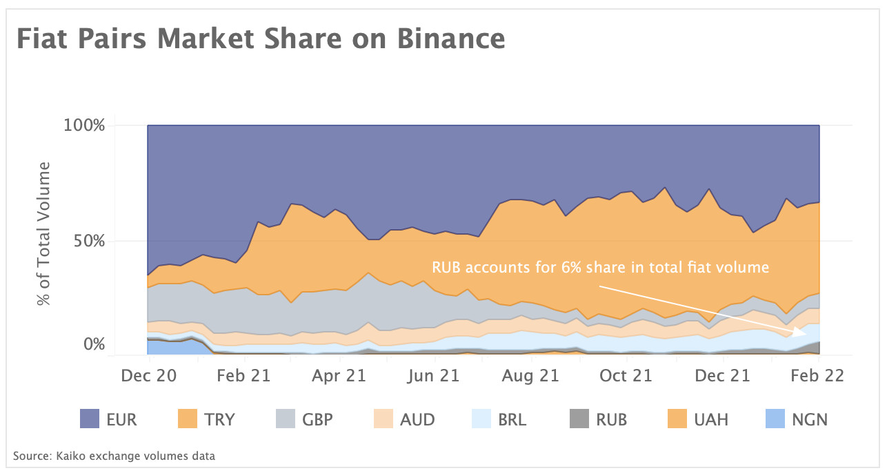 Das Gesamtvolumen ist im Vergleich zu anderen auf Fiat lautenden Paaren immer noch relativ gering, zeigt aber einen Anstieg. Das Volumen der türkischen Lira ist im vergangenen Jahr inmitten einer Rekordabwertung der Währung ebenfalls stark angestiegen, was die wichtige Rolle von Binance als Anbieter von globalen Krypto-Handelsdienstleistungen zeigt.