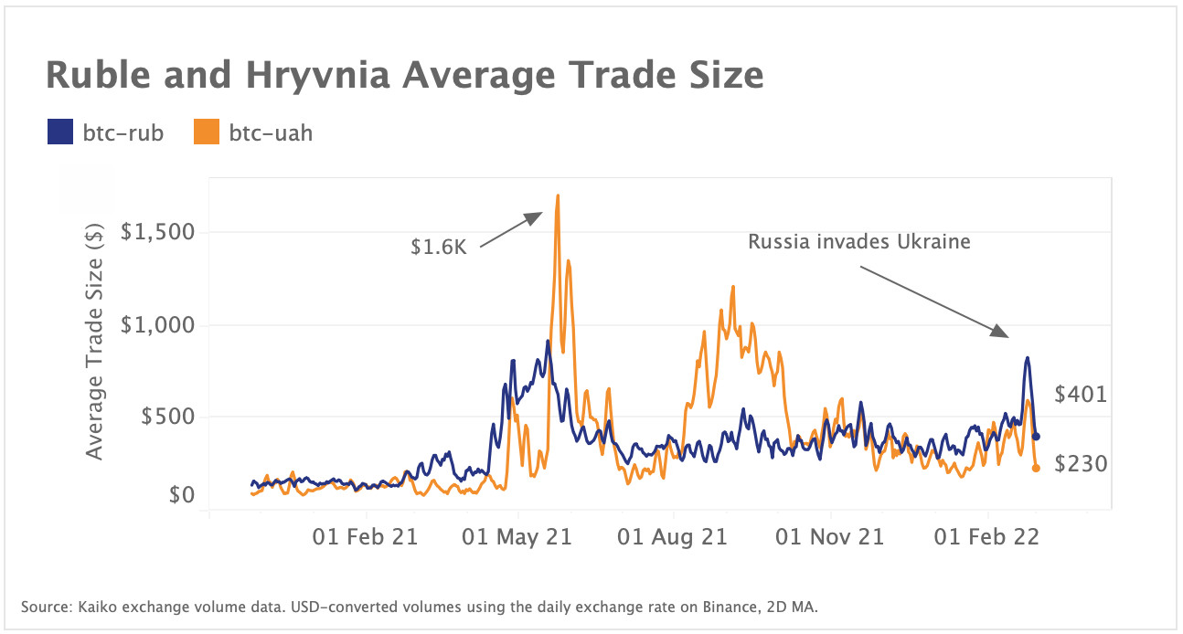 Der Anstieg der Handelsgrössen ist darauf zurückzuführen, dass das Krypto-Handelsvolumen in Rubel und Griwnja nach dem Einmarsch Russlands sprunghaft angestiegen ist, was durch die rekordverdächtige Abwertung der lokalen Währung und die Marktstörungen begünstigt wurde. Insgesamt blieb die durchschnittliche Handelsgrösse für beide Paare relativ klein, was darauf hindeutet, dass die derzeit hohen Volumina hauptsächlich von Privatkunden getrieben werden. Dies steht im Einklang mit den On-Chain-Daten, welche auf eine aktive Akkumulation im Einzelhandel hindeuten. Zum Vergleich: Die durchschnittliche Handelsgrösse von BTC-EUR auf Binance beträgt etwa 2'000 Dollar.
