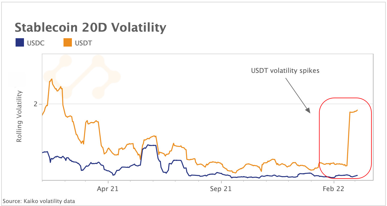 Bei Tether (USDT), dem weltweit grössten Stablecoin, stieg die 20D-Volatilität auf den höchsten Stand seit mehr als einem Jahr, als die Märkte sich erholten und dann rasch wieder abverkauften. Im Gegensatz dazu behielt der zweitgrösste Stablecoin - der USD Coin (USDC) von Circle (Marktkapitalisierung von 54 Mrd. USD) - während der gesamten Volatilität seine 1:1 USD-Bindung bei. An zentralen Börsen macht USDT die grosse Mehrheit des Stablecoin-Volumens aus, wobei mehr als 60% aller Bitcoin-Trades gegen Tether ausgeführt werden. USDC werden vor allem in dezentralen Finanzanwendungen verwendet (DEX-Preisfeeds sind in unserer Messung der 20D-Volatilität nicht enthalten). Stablecoins wie Tether sind in Zeiten marktweiter Volatilität aufgrund ihrer 1:1-USD-Bindung sehr attraktiv und verzeichneten in letzter Zeit hohe Volumina gegenüber der russischen und ukrainischen Währung, die auf Rekordtiefs gesunken sind.